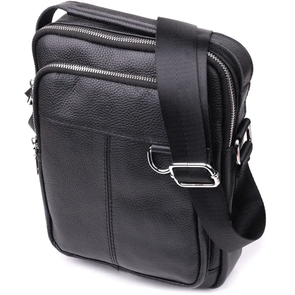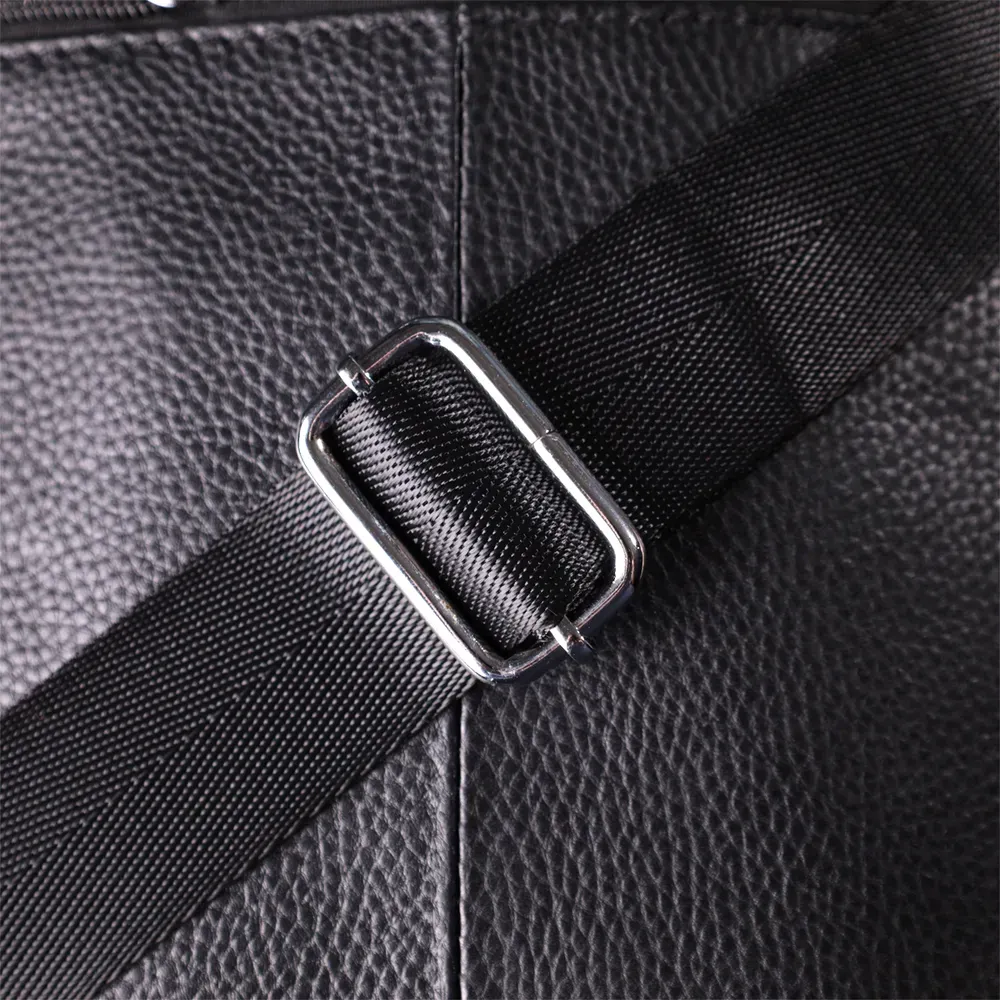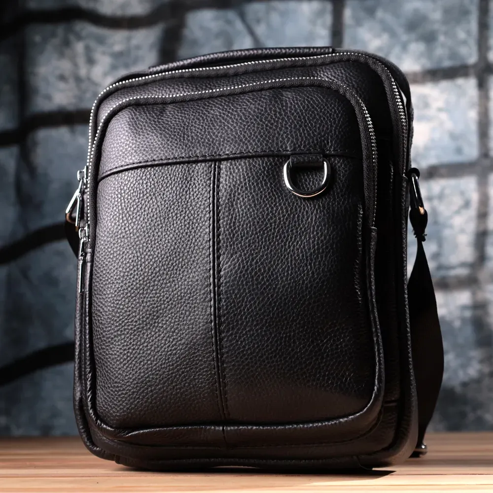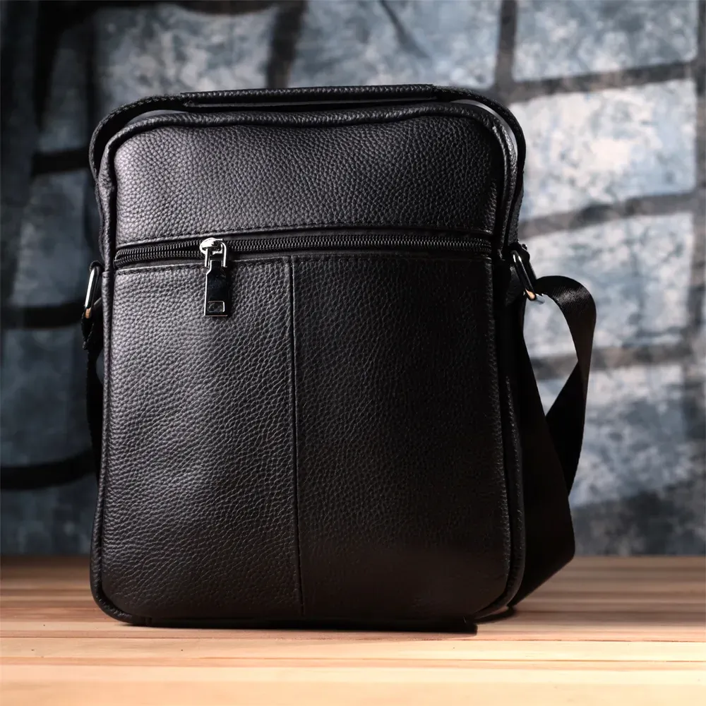 Зручна чоловіча сумка із натуральної шкіри. Виріб виконаний із зернистої шкіри чорного кольору. Усередині аксесуару щільна текстильна підкладка чорного кольору. Сумка буде ідеальним варіантом на кожен день. Модель дуже зручна. Класичний дизайн ніколи не вийде із моди. Така сумка підійде під будь-які речі з гардеробу. Модель доповнена якісною фурнітурою у дизайні виробу.