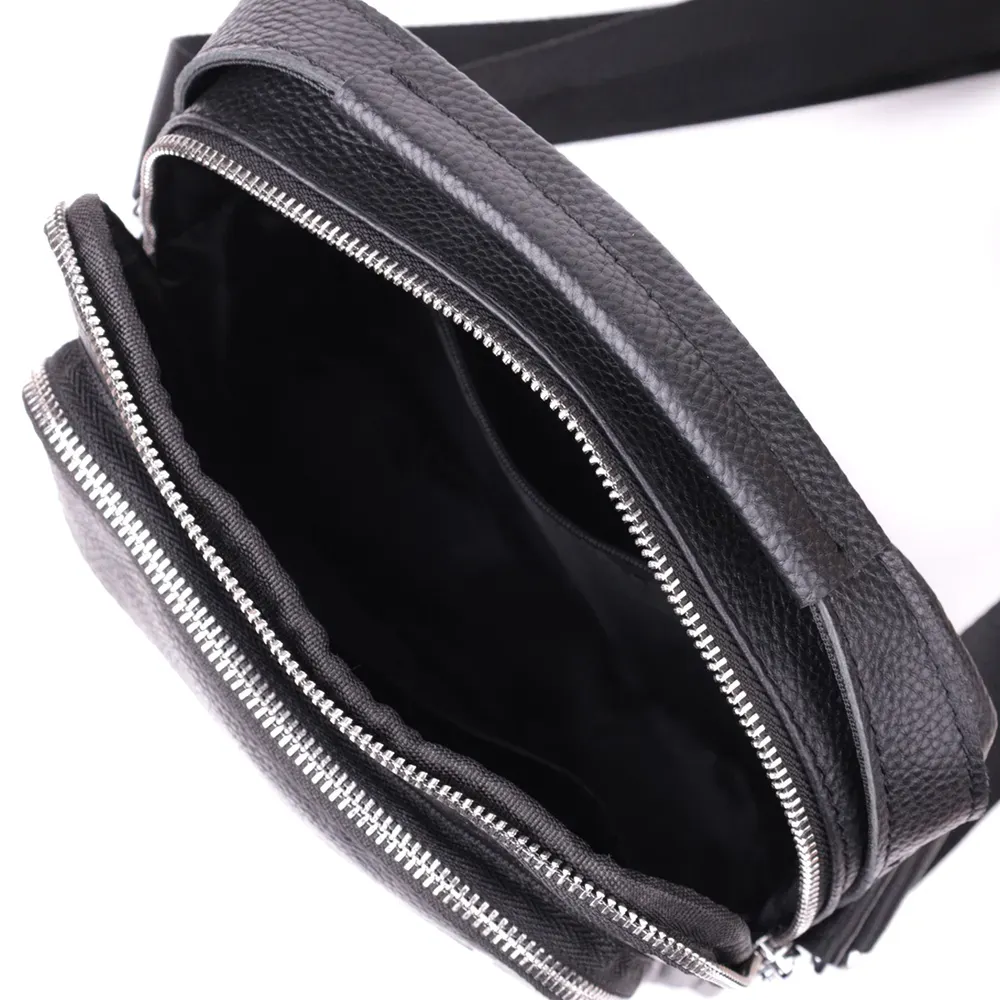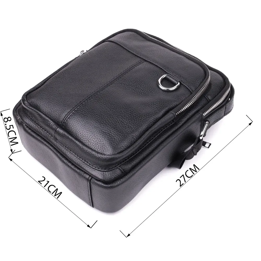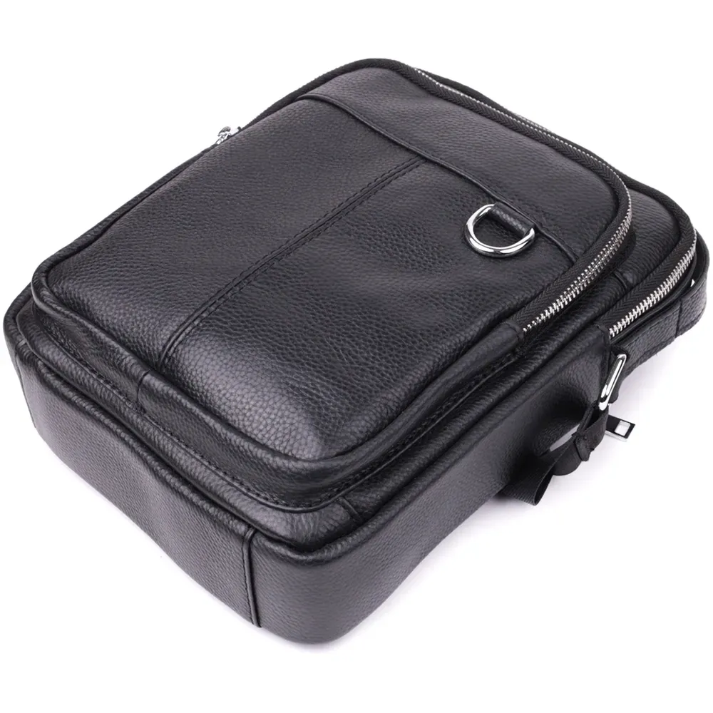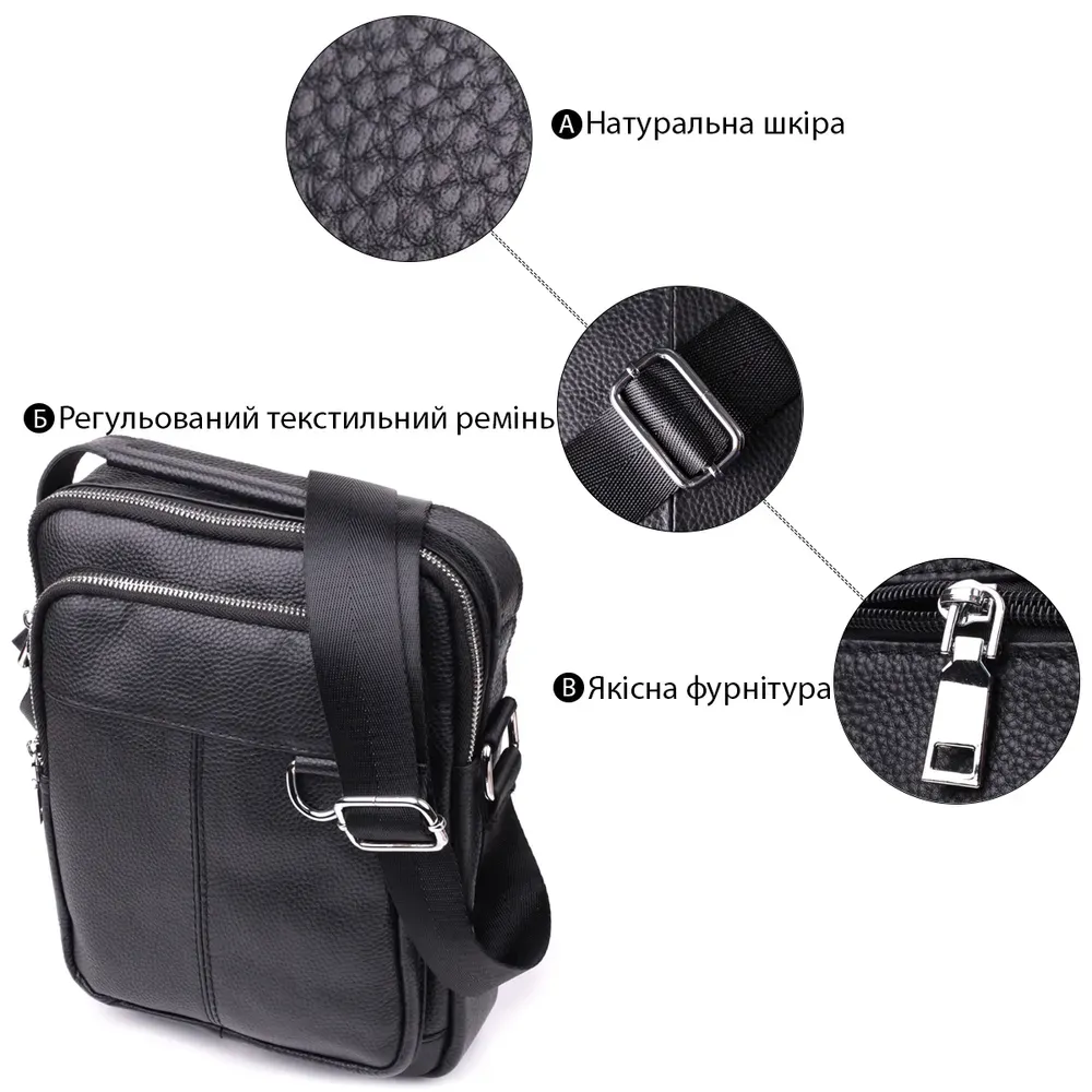 Зручна чоловіча сумка із натуральної шкіри. Виріб виконаний із зернистої шкіри чорного кольору. Усередині аксесуару щільна текстильна підкладка чорного кольору. Сумка буде ідеальним варіантом на кожен день. Модель дуже зручна. Класичний дизайн ніколи не вийде із моди. Така сумка підійде під будь-які речі з гардеробу. Модель доповнена якісною фурнітурою у дизайні виробу.