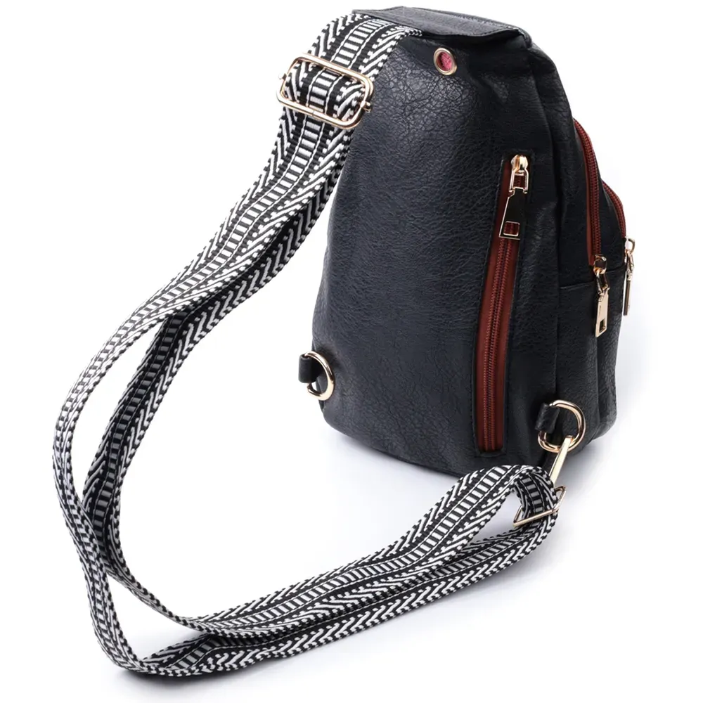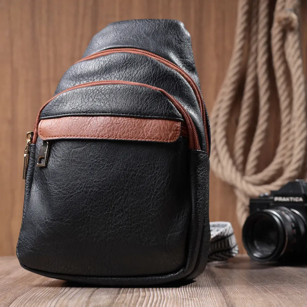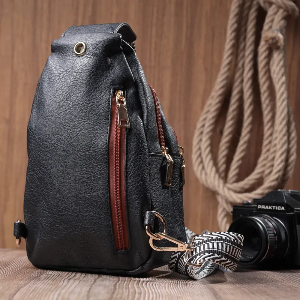 Оригінальний варіант сумки для жінок на кожен день із якісної екошкіри, яка є альтернативою натуральній шкірі. Дана модель складається з одного основного відділення, яке закривається на блискавку і в якому знаходиться кишеня на блискавці і три кишені для кредитних карток усередині, а також трьох кишень зовні та одного отвору для кабелю або навушників, що дуже зручно в сучасному світі. Акцентом даної моделі є зручний регульований плечовий ремінець у етнічному стилі, що дуже модно вже кілька сезонів. Екошкіра - високоякісна альтернатива натуральному матеріалу, яка дуже стійка до тертя, до низьких температур, відмінно носиться на відміну від інших штучних матеріалів, а також має гіпоалергенний склад на відміну від натуральної шкіри. Мода не стоїть на місці, на зміну класичним сумкам приходять нові моделі, які обумовлені сучасним часом, саме такою є слінг сумка - зручна, практична, невелика, але містка і головне якісна.