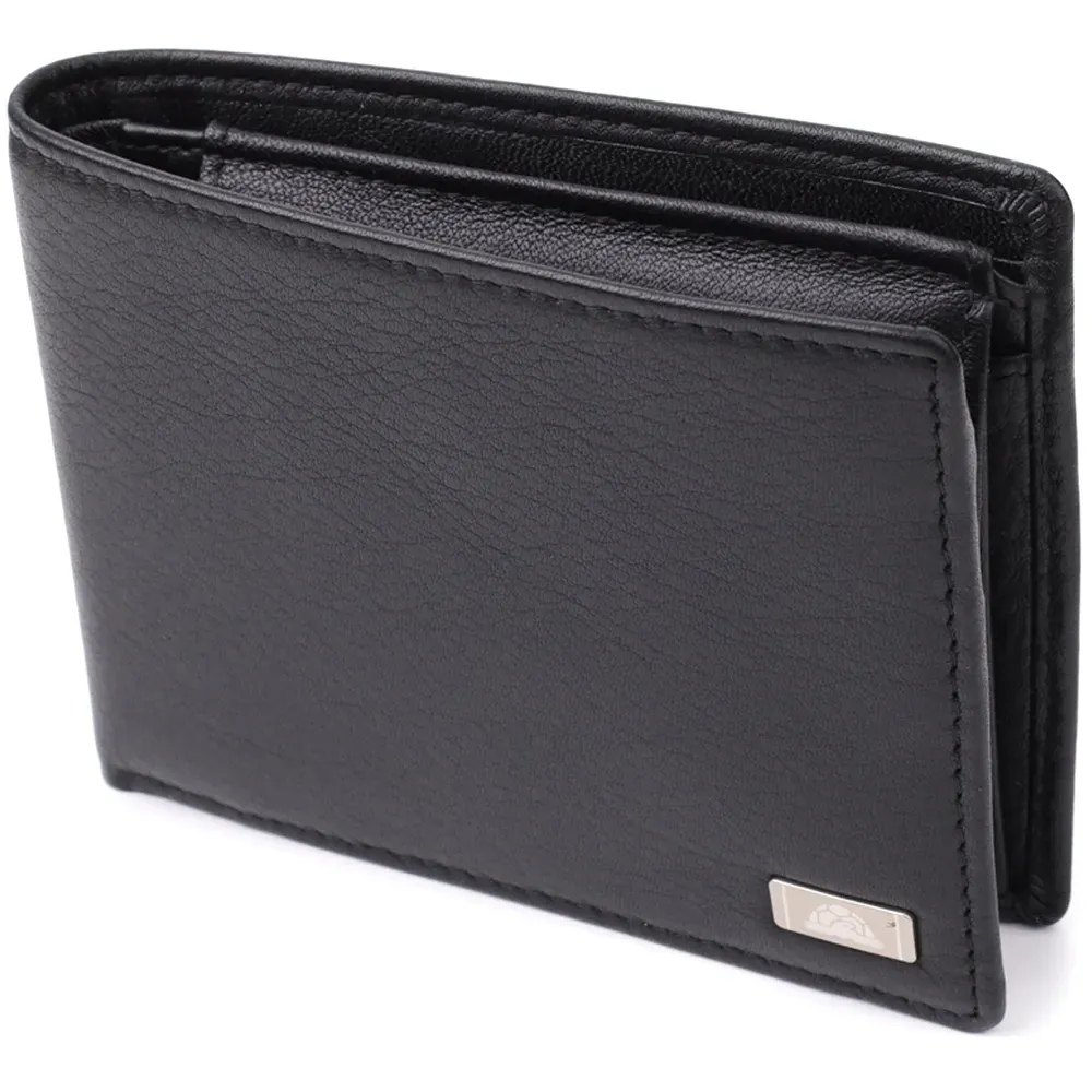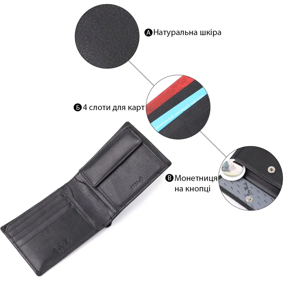 Гаманець виконаний з першокласної італійської натуральної шкіри, відрізняється м'якістю та довговічністю. Усередині передбачені чотири осередки для карток, дві прилеглі кишені, монетниця на кнопці та два відділення для купюр. На лицьовій стороні в правому нижньому кутку розташований металевий логотип бренду, що підкреслює статус і справжність виробу. Дизайн без застібки робить модель лаконічною та зручною у використанні.