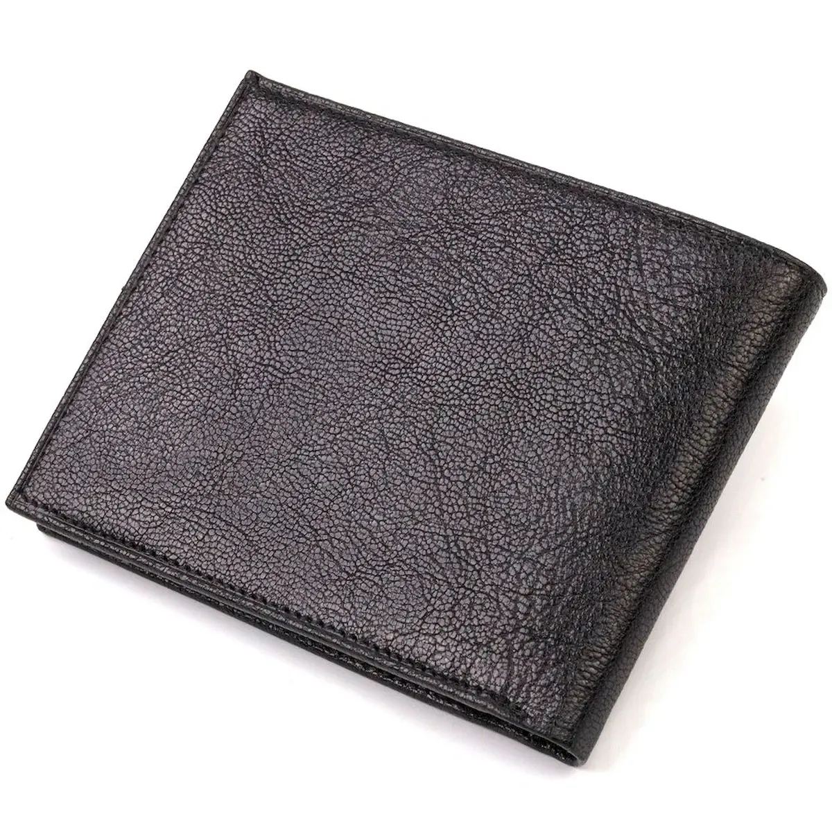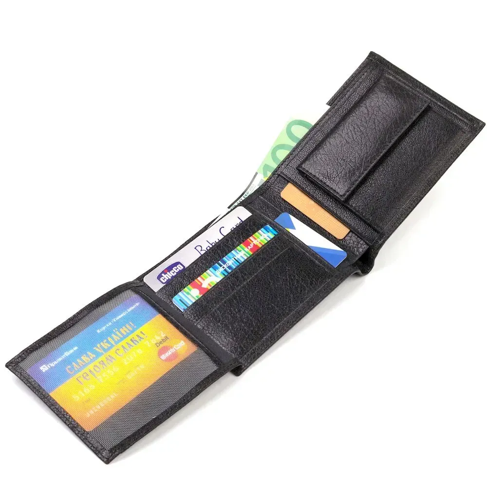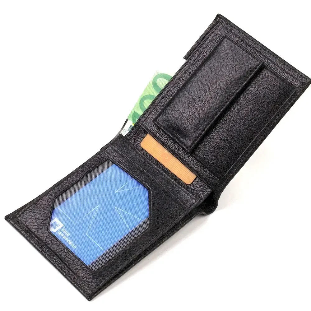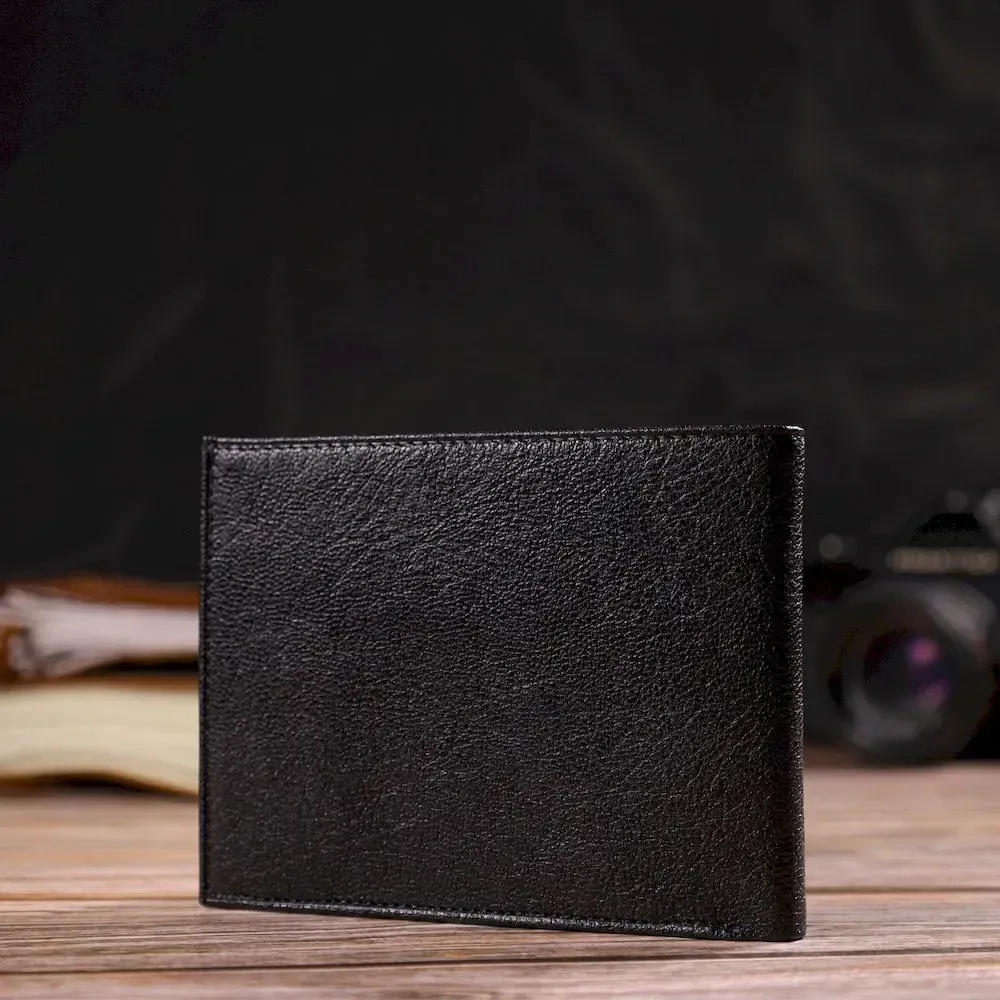 Стильный мужской кошелек в классическом черном цвете, из натуральной кожи. Аксессуар имеет одно основное отделение с перегородкой, в которое помещаются купюры всех номиналов, четыре кармана для карточек, два кармана под сеточкой для документов, монетницу и три прилегающих кармана. Закрывается аксессуар пополам без застежки. Упакован бумажник картонную коробку. Кожаный кошелек является отменным подарком для родных и близких людей.