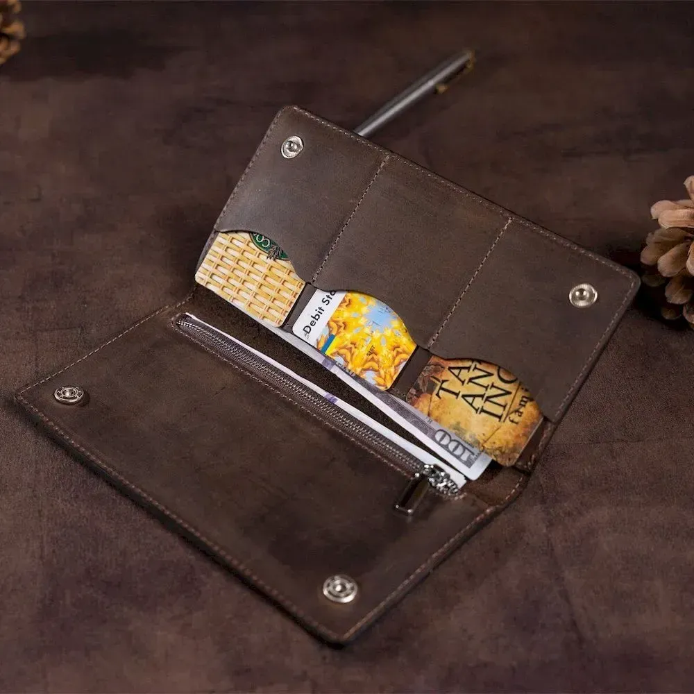Мужской бумажник матовый из натуральной кожи. Удобно лежит в руке и имеет простой и функциональный дизайн. Кармашек на молнии при желании вы можете использовать для мелочи. С таким аксессуаром ваши средства всегда будут в безопасности. Купюры в бумажник помещаются в развернутом виде. Закрывается кошелек на две кнопки внутри аксессуара. Изделие легко поместится в сумку и однозначно порадует своего обладателя.