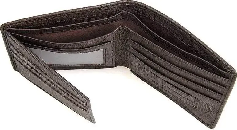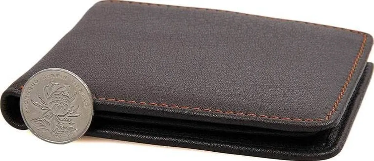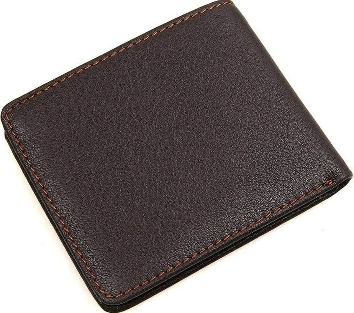 Компактный мужской бумажник коричневого цвета. Аксессуар выполнен из натуральной высококачественной глянцевой кожи приятной на ощупь. Кошелек аккуратно прошит светло-коричневой нитью, что придает ему изюминку. Аксессуар упакован в белый пылезащитный мешок.