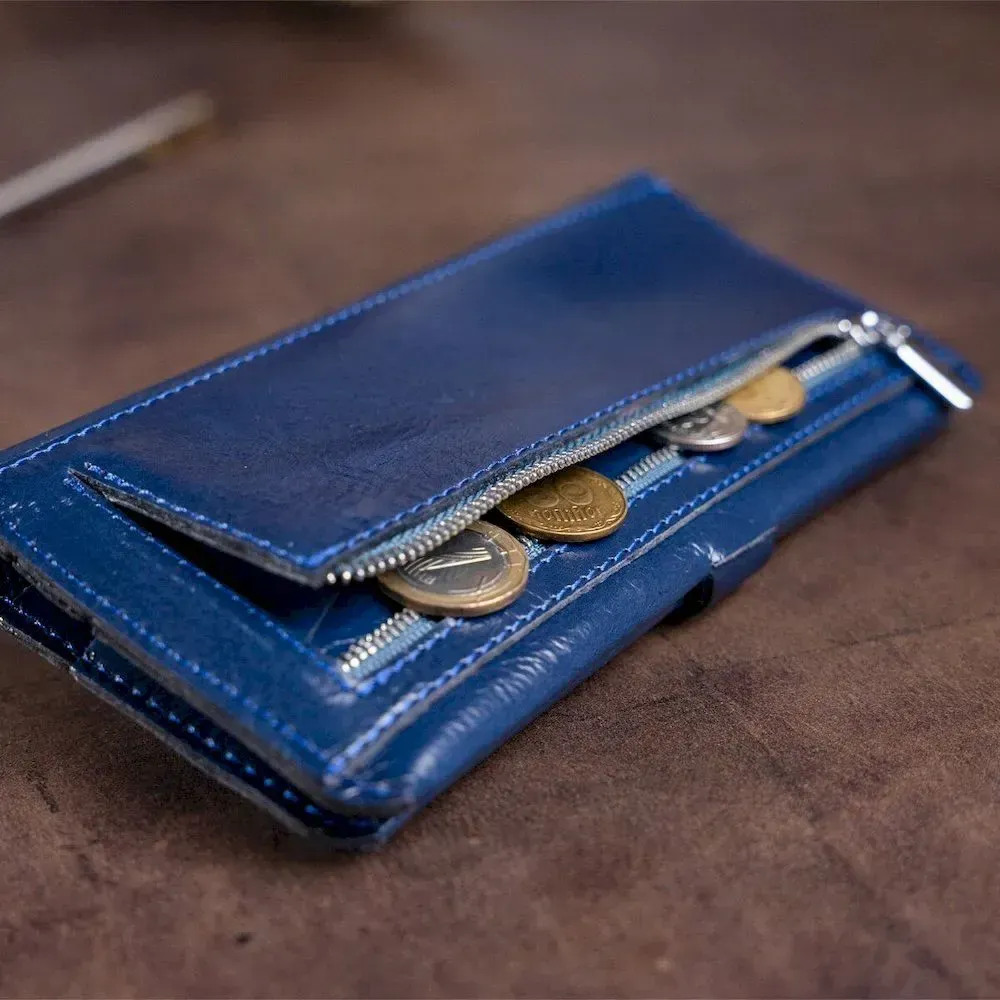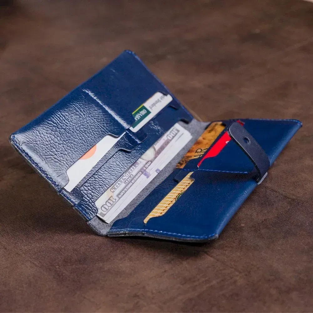 Шикарный мужской бумажник из натуральной кожи типа алькор. Особенностью такой кожи являются царапинки и потёртости, как в винтажной коже, но при этом она имеет блеск как гладкая кожа. Внутри бумажника два основных отделения для бумажных купюр и восемь слотов для кредиток. Бумажник имеет естественный запах натуральной кожи и мягкий, приятный на ощупь. Модель застегивается на петельку из натуральной кожи. По краям изделие прошито синей нитью. На лицевой стороне бумажника есть тисненый логотип бренда. Бумажник подойдет как для мужчины так и женщины. Аксессуар будет прекрасным подарком по любому поводу или без.