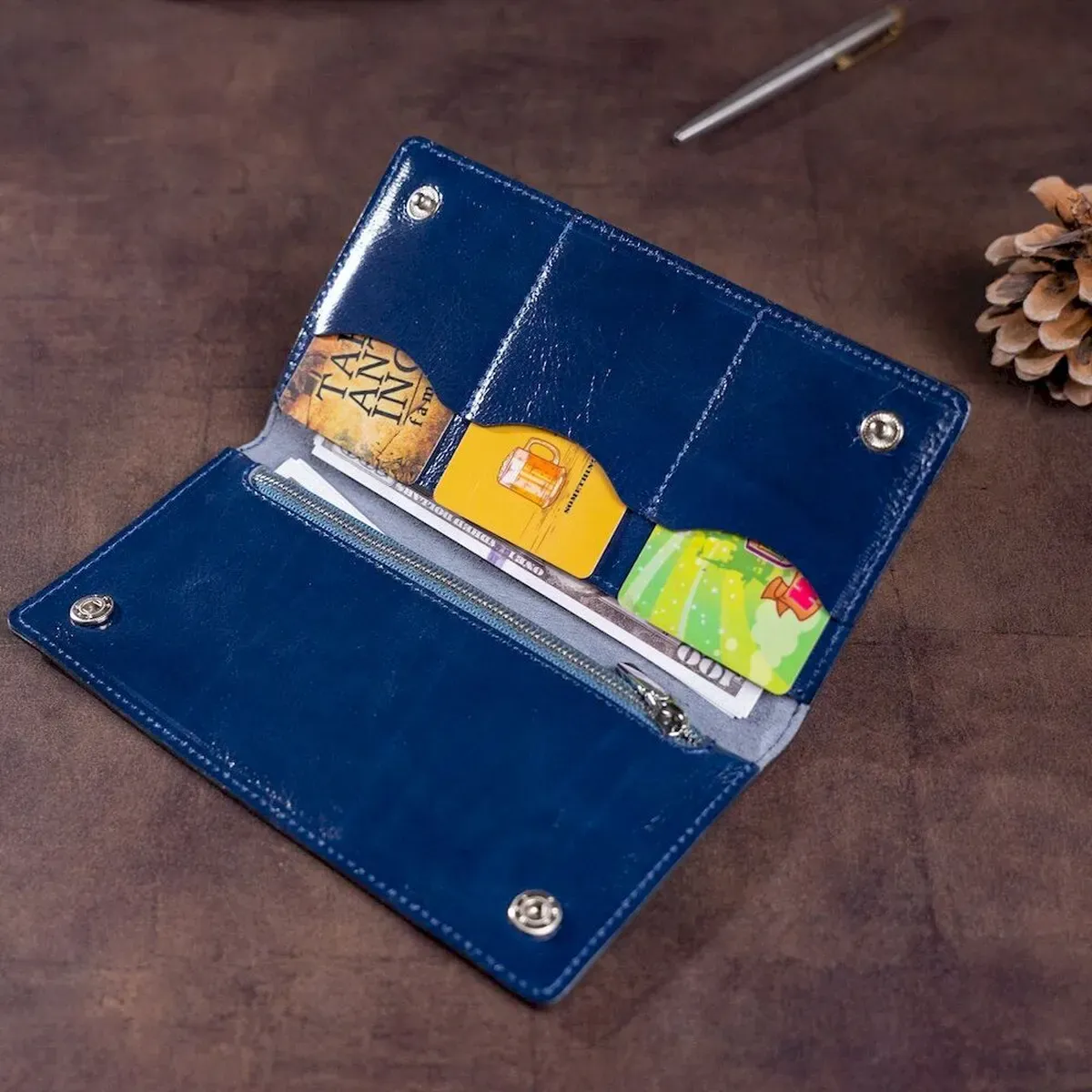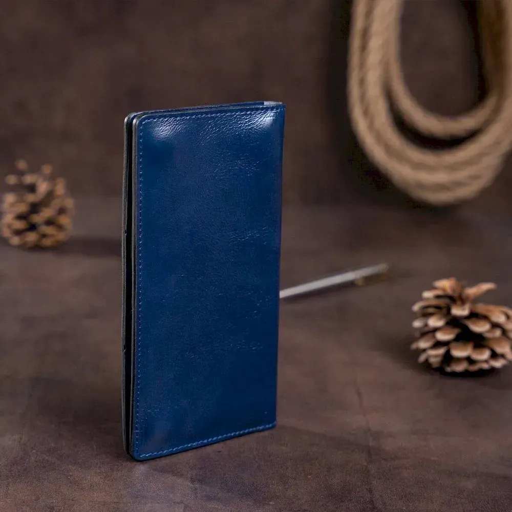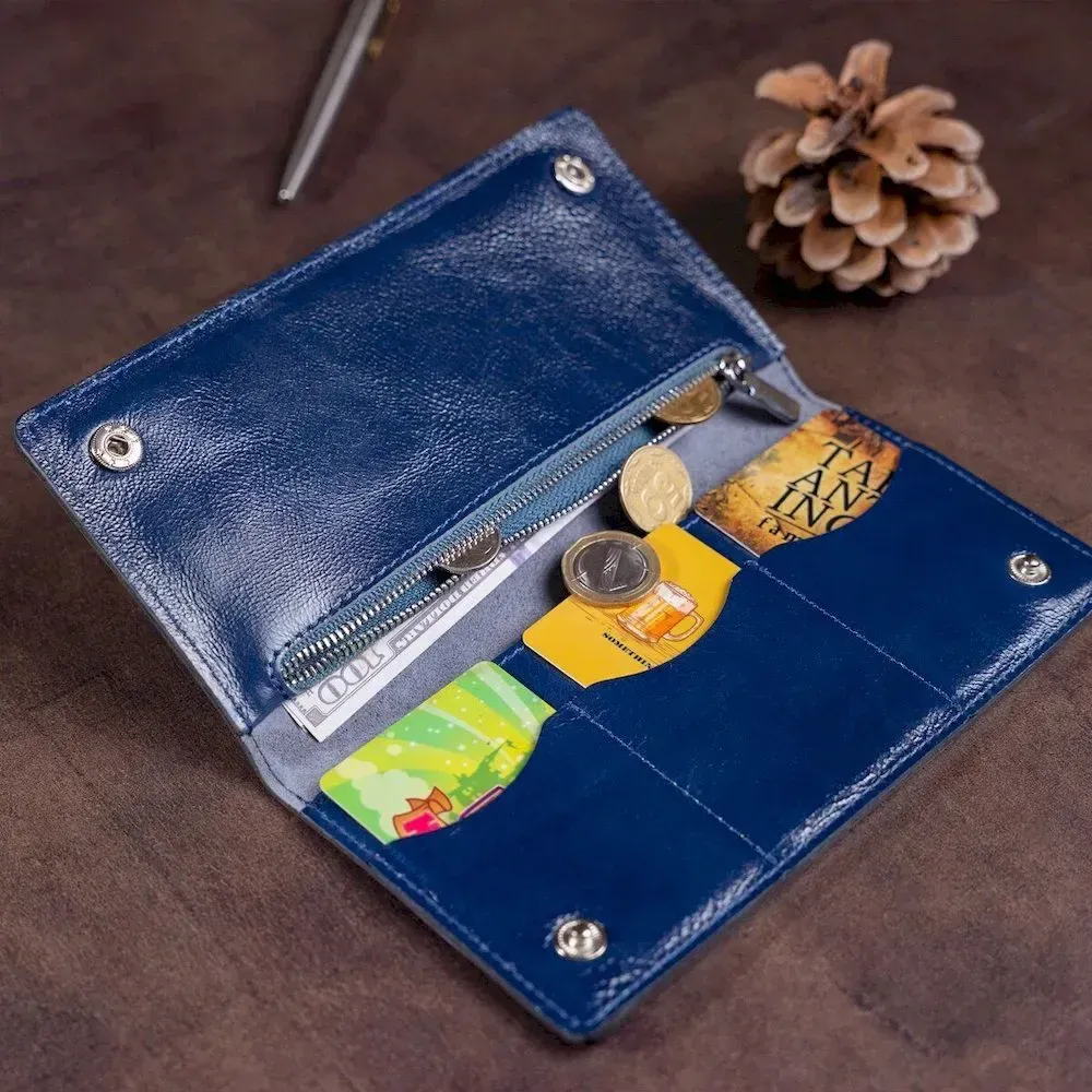 Солидный и мягкий кожаный бумажник стильного синего цвета. Аксессуар создан для людей, которые ценят стиль и комфорт. Изделие прошито по краям ровной строчкой. Дополняет аксессуар тисненый логотип бренда на лицевой стороне аксессуара. Изделие закрывается на две кнопки сверху и снизу. Такой бумажник станет прекрасным помощником для своего владельца.