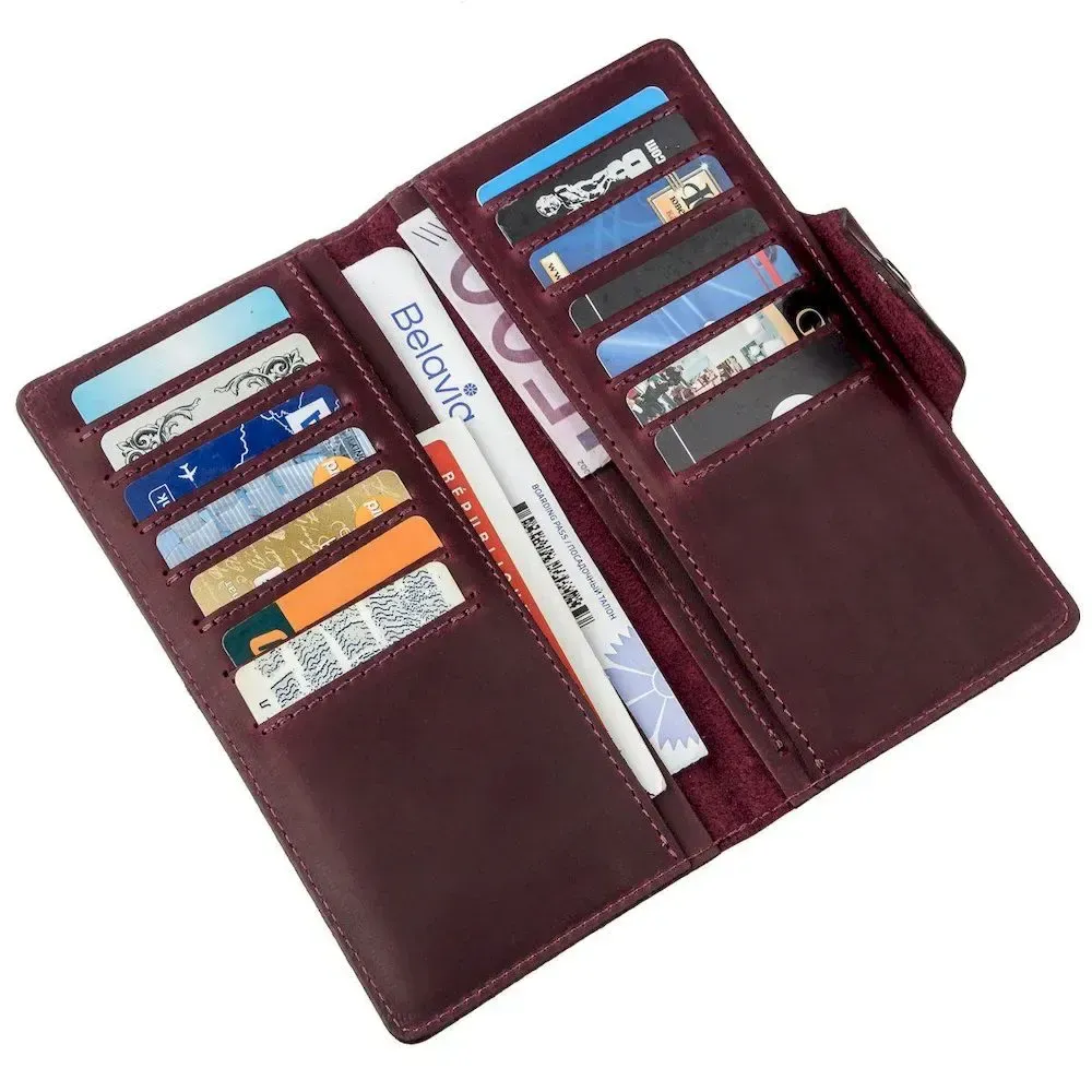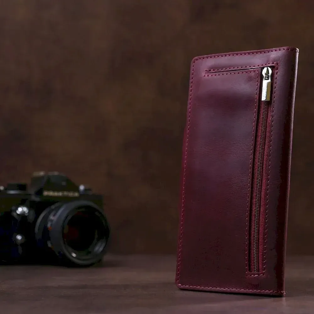 Кошелек из натуральной винтажной кожи оригинального бордового цвета. Застегивается на хлястик с кнопками. Модель имеет матовое покрытие. Достаточно оригинально смотрится. Богатый внешний вид. Сверху прошита ровной строчкой в дизайн изделия. Имеет строгий выдержанный дизайн в классическом стиле. Идеально подойдет для тех, кто любит яркость и оригинальность. Не занимает много места в вашей сумочке. Тонкий и одновременно вместительный. Будет отличным подарком. Кошелек имеет высокую износостойкость к потертостям и трещинам. Модель доступна в разных цветах и типах кожи. Мы уверены, что бумажник удивит своего владельца.