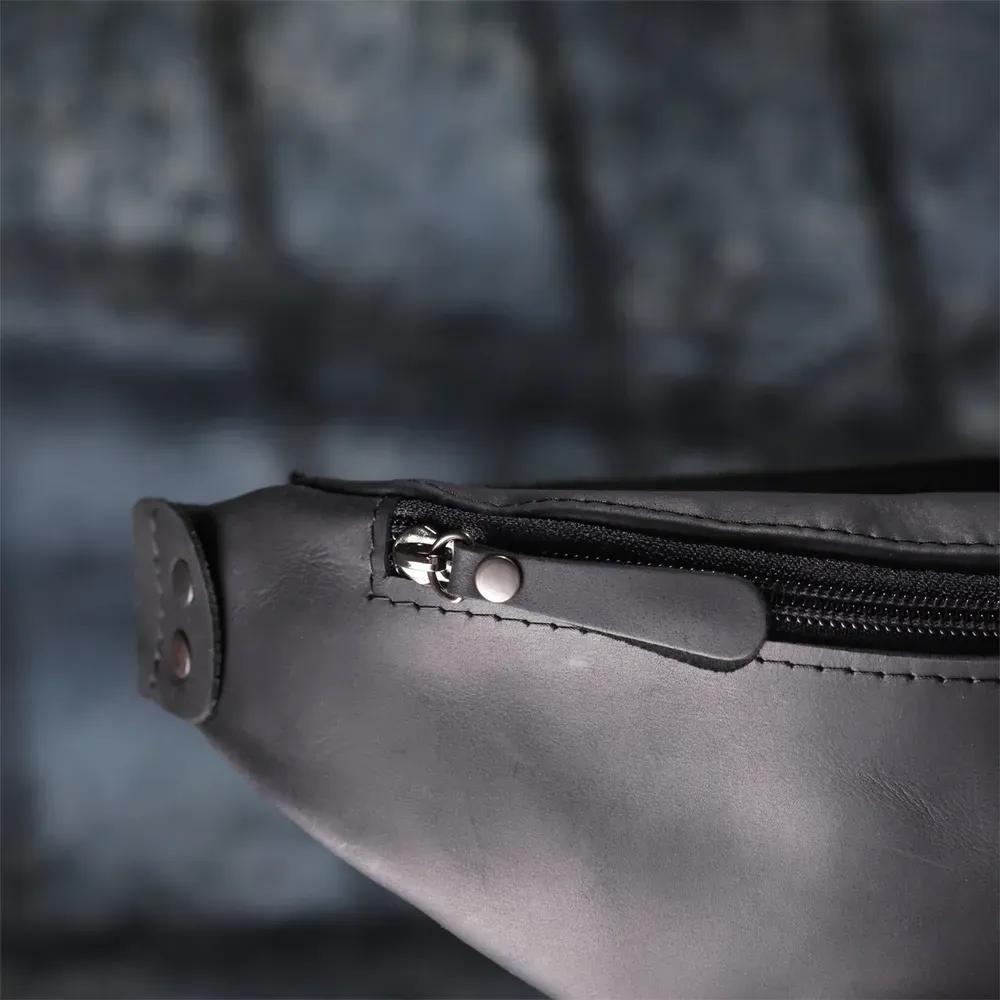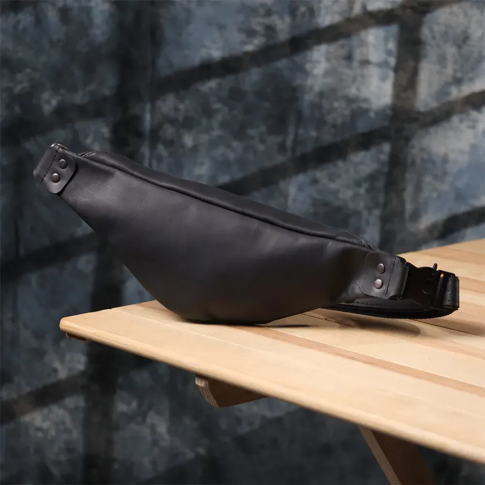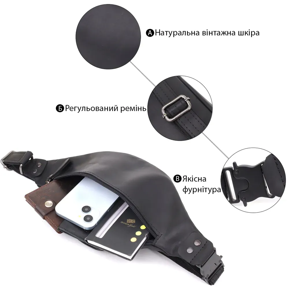 Чоловіча сумка-бананка з вінтажної шкіри в чорному кольорі — стиль, перевірений часом. Ця стильна чоловіча сумка-бананка від українського бренду Shvigel виготовлена з натуральної вінтажної шкіри, що надає їй характеру та благородної фактури. Завдяки якісній обробці шкіра не тільки виглядає розкішно, але й має високу зносостійкість - аксесуар прослужить довго, не втрачаючи естетичного вигляду.
