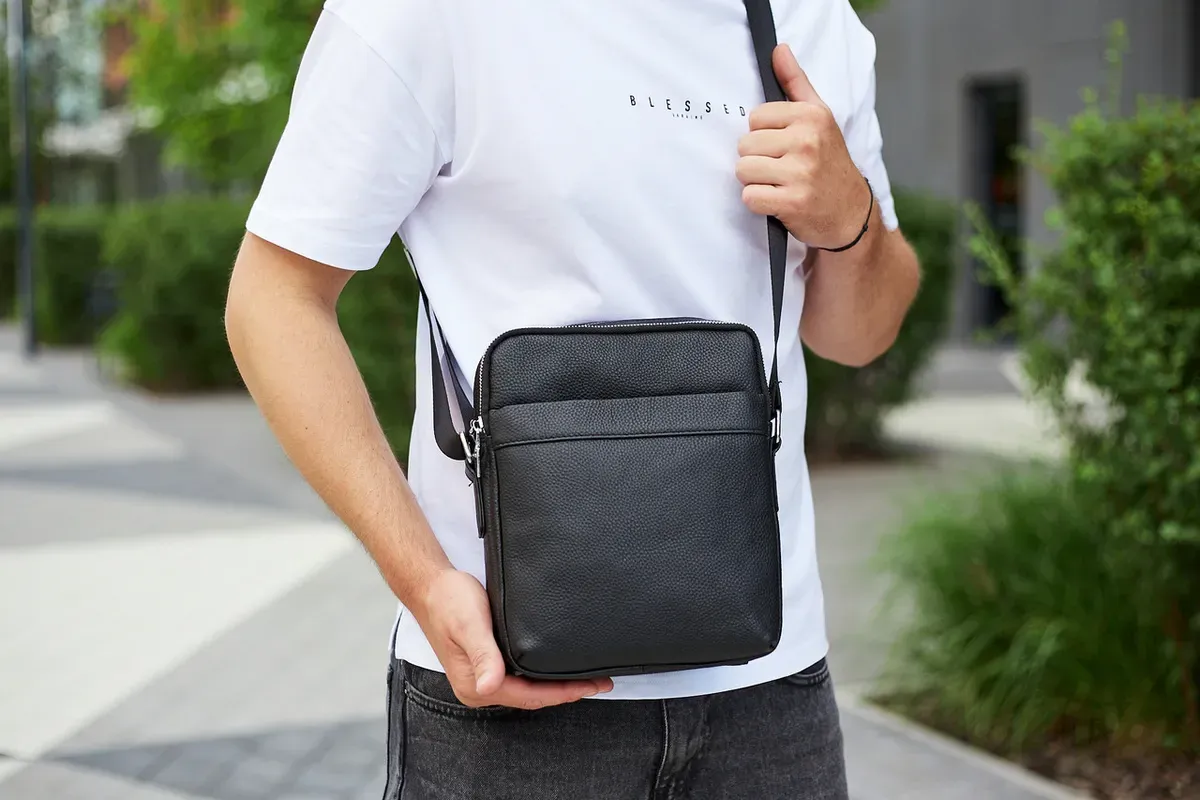 Чудова чоловіча сумка вертикального формату, виготовлена з натуральної шкіри чорного кольору. Вона відмінно доповнить як діловий, так і повсякденний стиль і стане Вашим улюбленим аксесуаром, завдяки своїй практичності. Чоловіча сумка через плече чорного кольору. У сумки є два основних відділення, всередині яких є маленька кишеня на замку і кишеня відкритого типу, а також з лицьової і тильної сторони є дві кишені на замку.