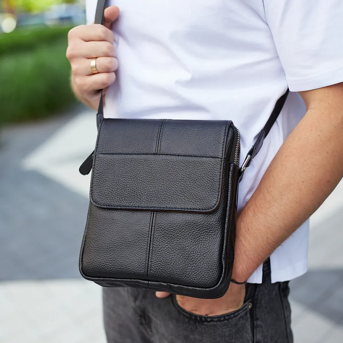 Класичний гарний аксесуар виконаний з високоякісних матеріалів. Цей стильний месенджер буде служити довго, оскільки модель комфортна і надійна. Аксесуар закривається накидним клапаном на магнітах і додатково металевої змійкою. Модель пошита з якісною підкладкою світлого кольору, шви виконані акуратно темною ниткою. Месенджер носиться на регульованому міцному текстильному ремінь зі шкіряною смужкою знімного типу. Аксесуар можна носити на плечі з допомогою текстильного ременя з шкіряною смужкою знімного типу, що легко регулюється по довжині.