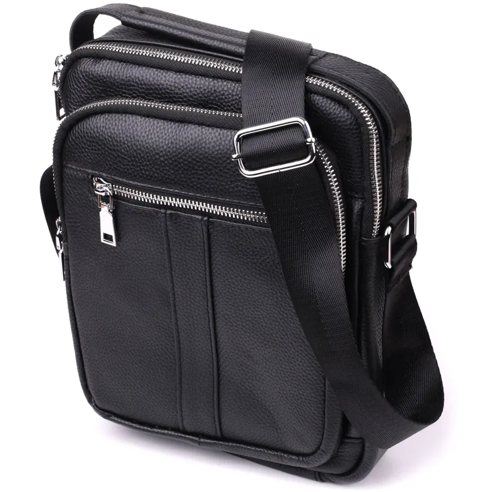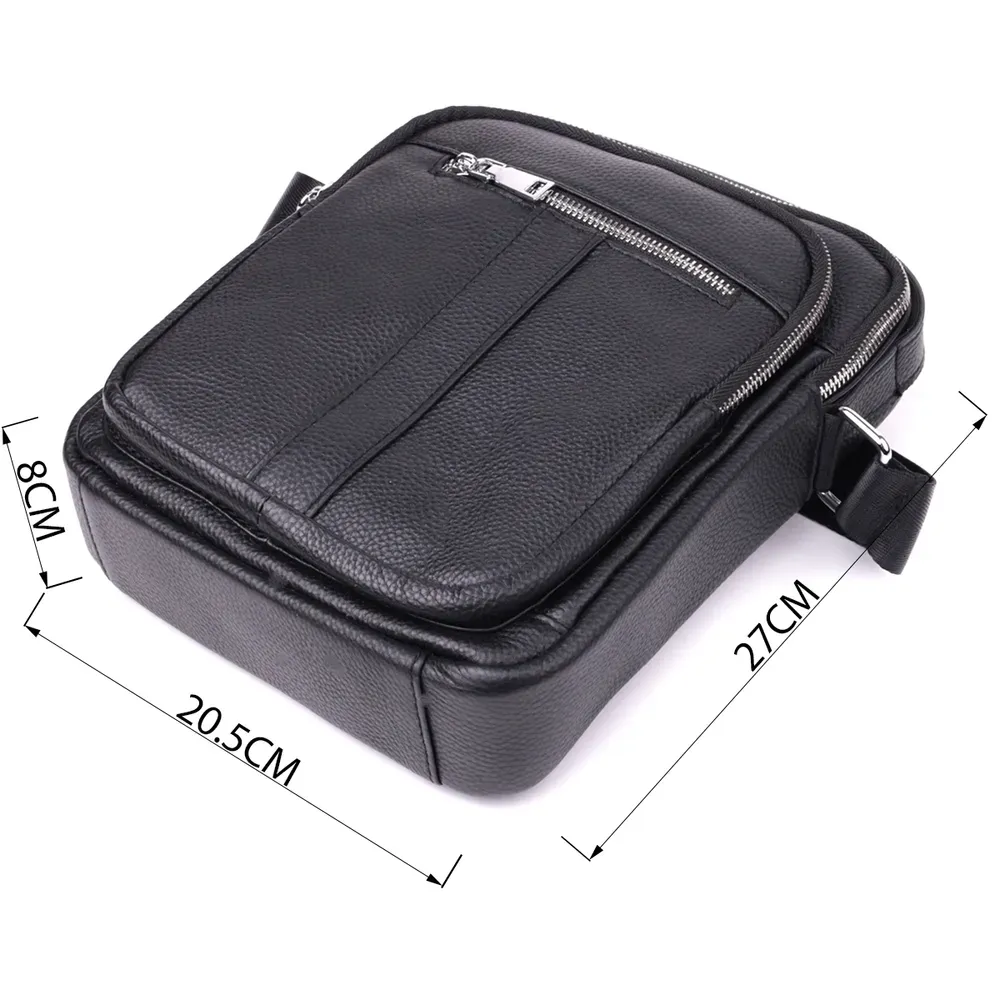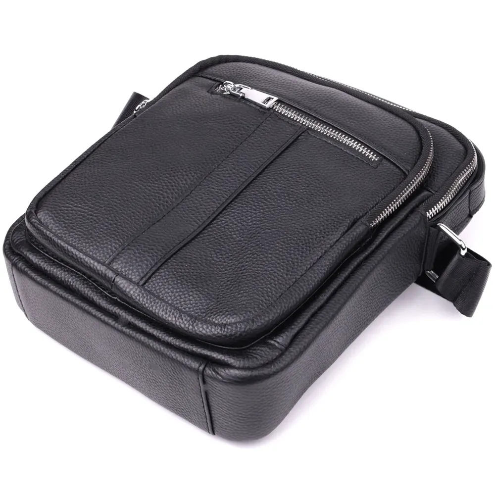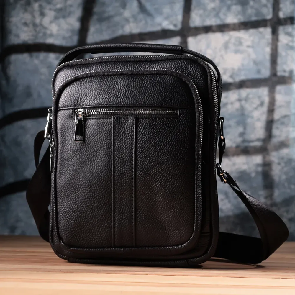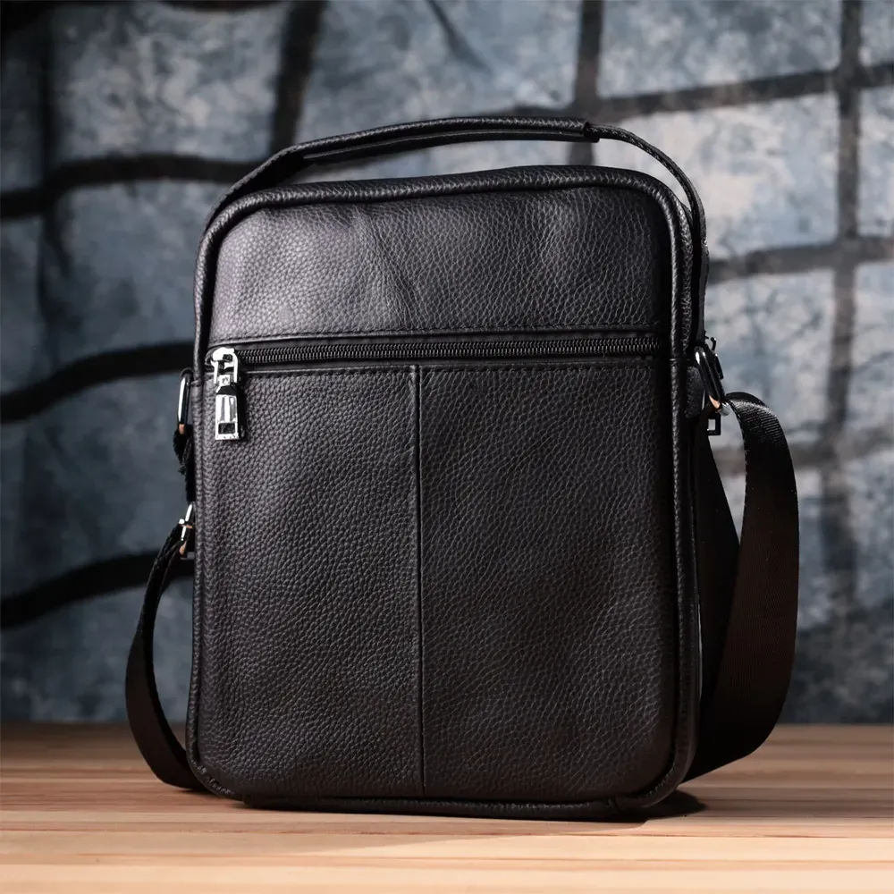 Сучасна чоловіча сумка з натуральної шкіри середнього розміру – практичний та стильний аксесуар на кожен день. Модель оснащена одним містким основним відділенням та чотирма кишенями різного розміру, що дозволяє зручно розмістити всі необхідні речі. Сумку можна носити в руці або на плечі завдяки зручній ручці і регульованому ременю. Аксесуар доповнений якісною фурнітурою сріблястого кольору, що підкреслює його значний зовнішній вигляд. Така сумка стане чудовим супутником у повсякденних справах, на роботі чи під час зустрічей, а також стане гідним подарунком для близької людини.