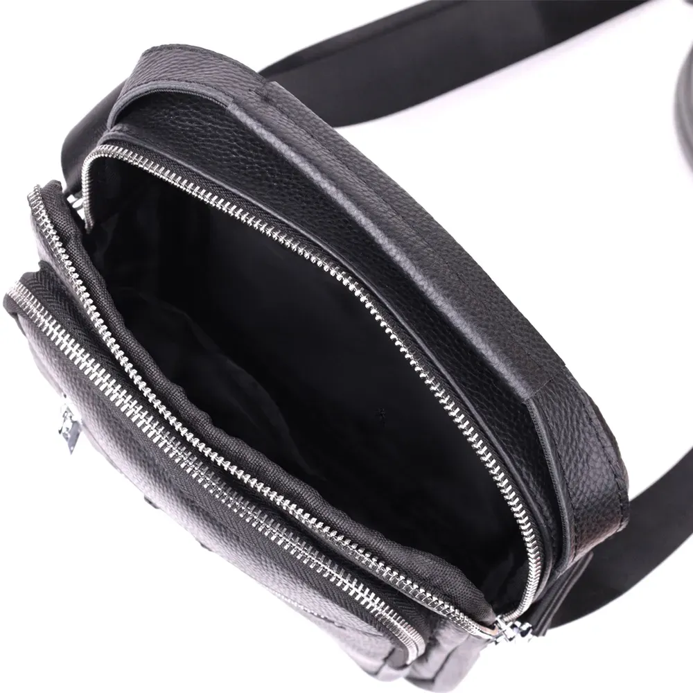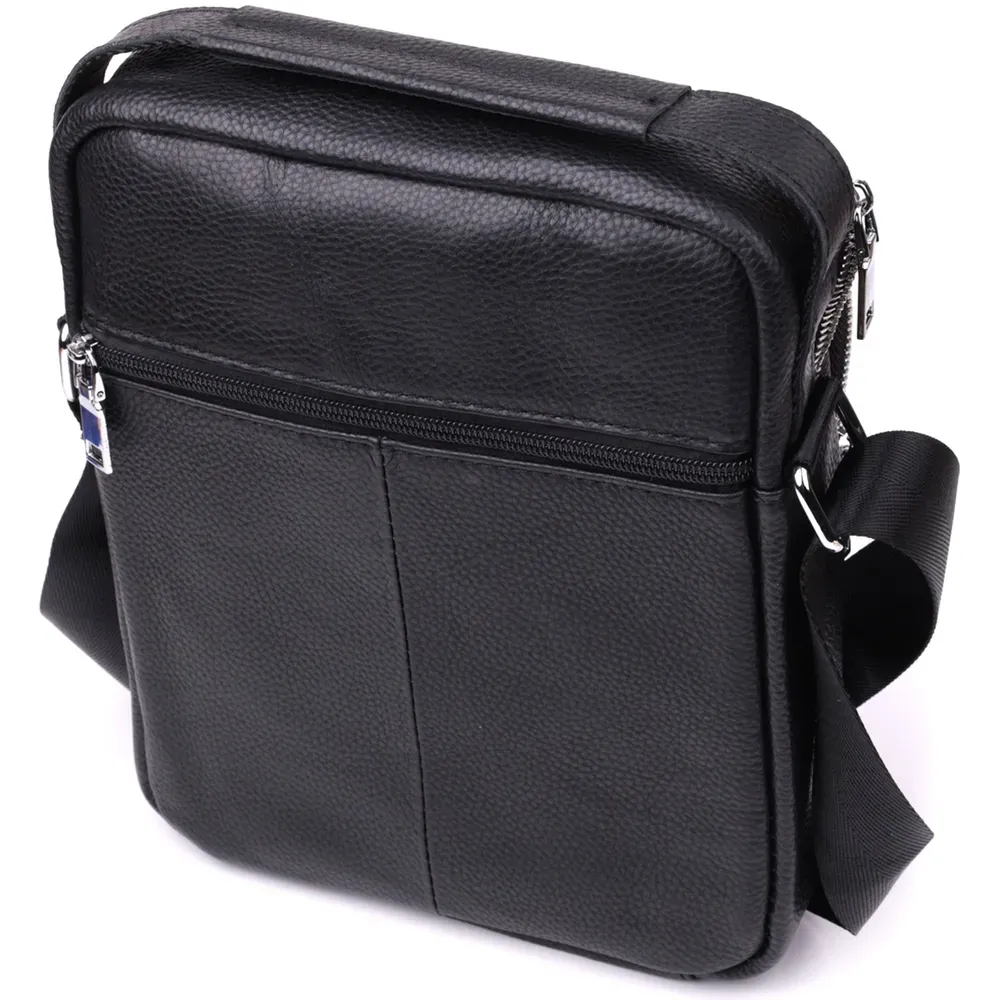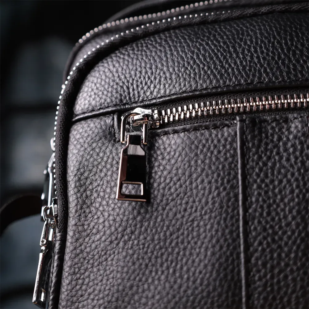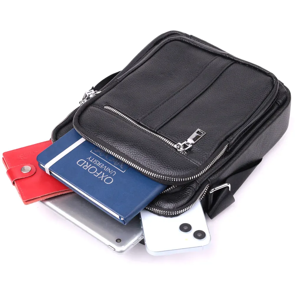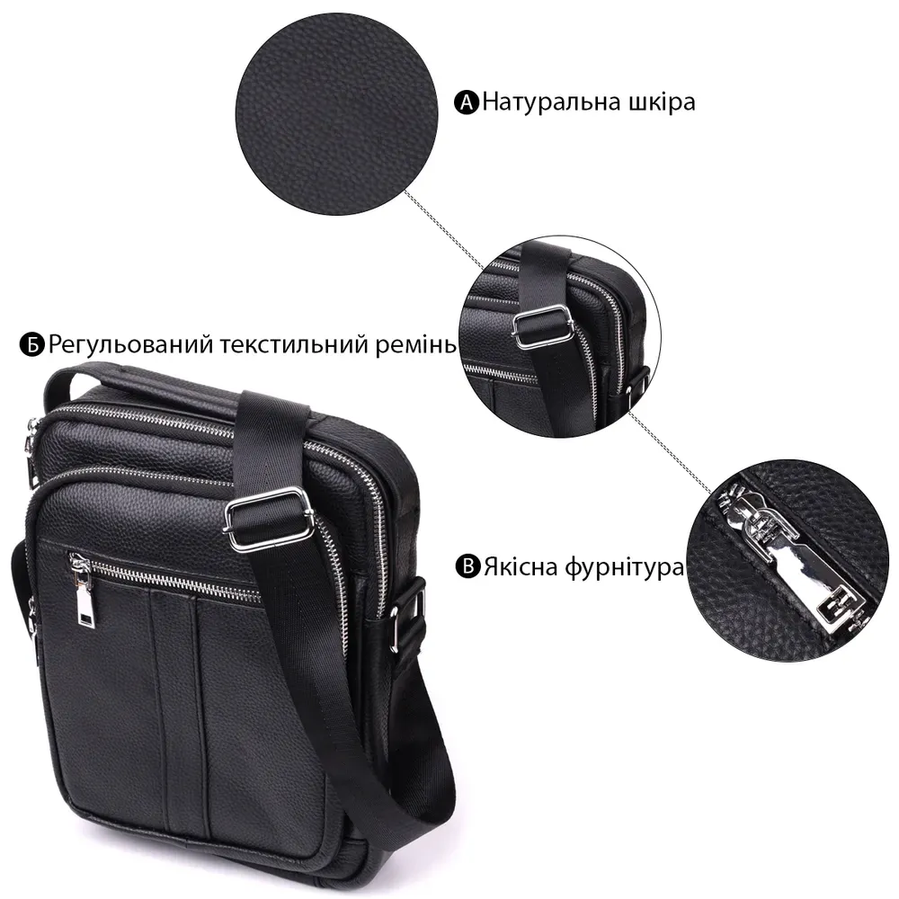 Сучасна чоловіча сумка з натуральної шкіри середнього розміру – практичний та стильний аксесуар на кожен день. Модель оснащена одним містким основним відділенням та чотирма кишенями різного розміру, що дозволяє зручно розмістити всі необхідні речі. Сумку можна носити в руці або на плечі завдяки зручній ручці і регульованому ременю. Аксесуар доповнений якісною фурнітурою сріблястого кольору, що підкреслює його значний зовнішній вигляд. Така сумка стане чудовим супутником у повсякденних справах, на роботі чи під час зустрічей, а також стане гідним подарунком для близької людини.