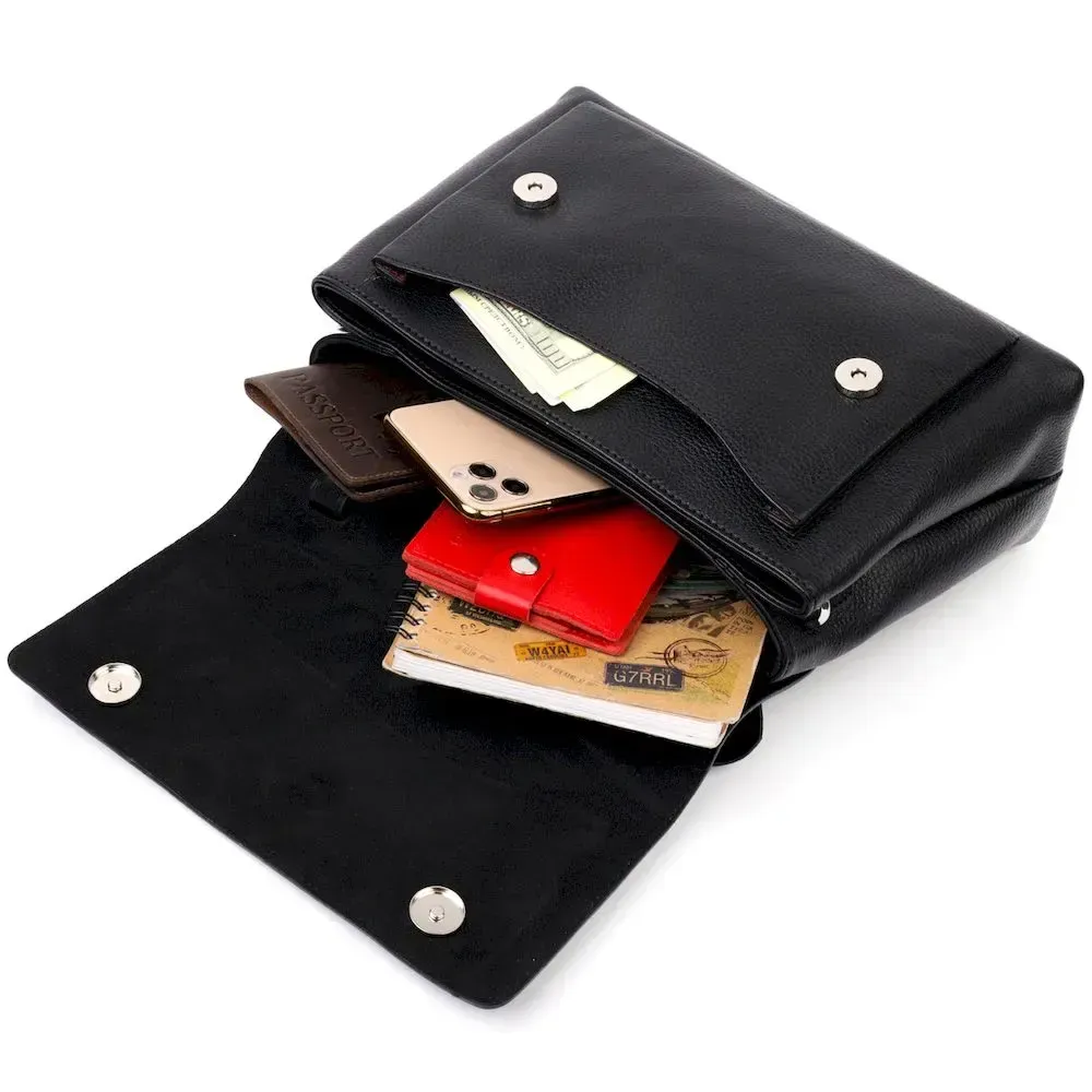 Женская компактная сумка небольшого размера из натуральной кожи, в классическом черном цвете. Фурнитура серебряного цвета. Сумку удобно носить на плече или через плечо. Сумка упакована в текстильный чехол. Сумка из натуральной кожи всегда будет отличным подарком любой женщине.