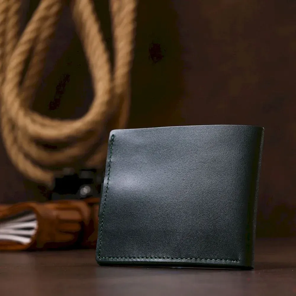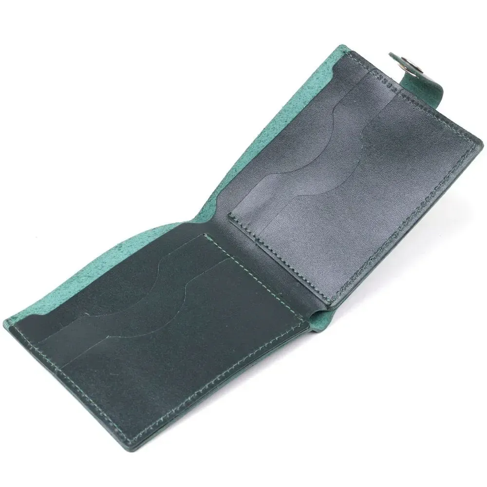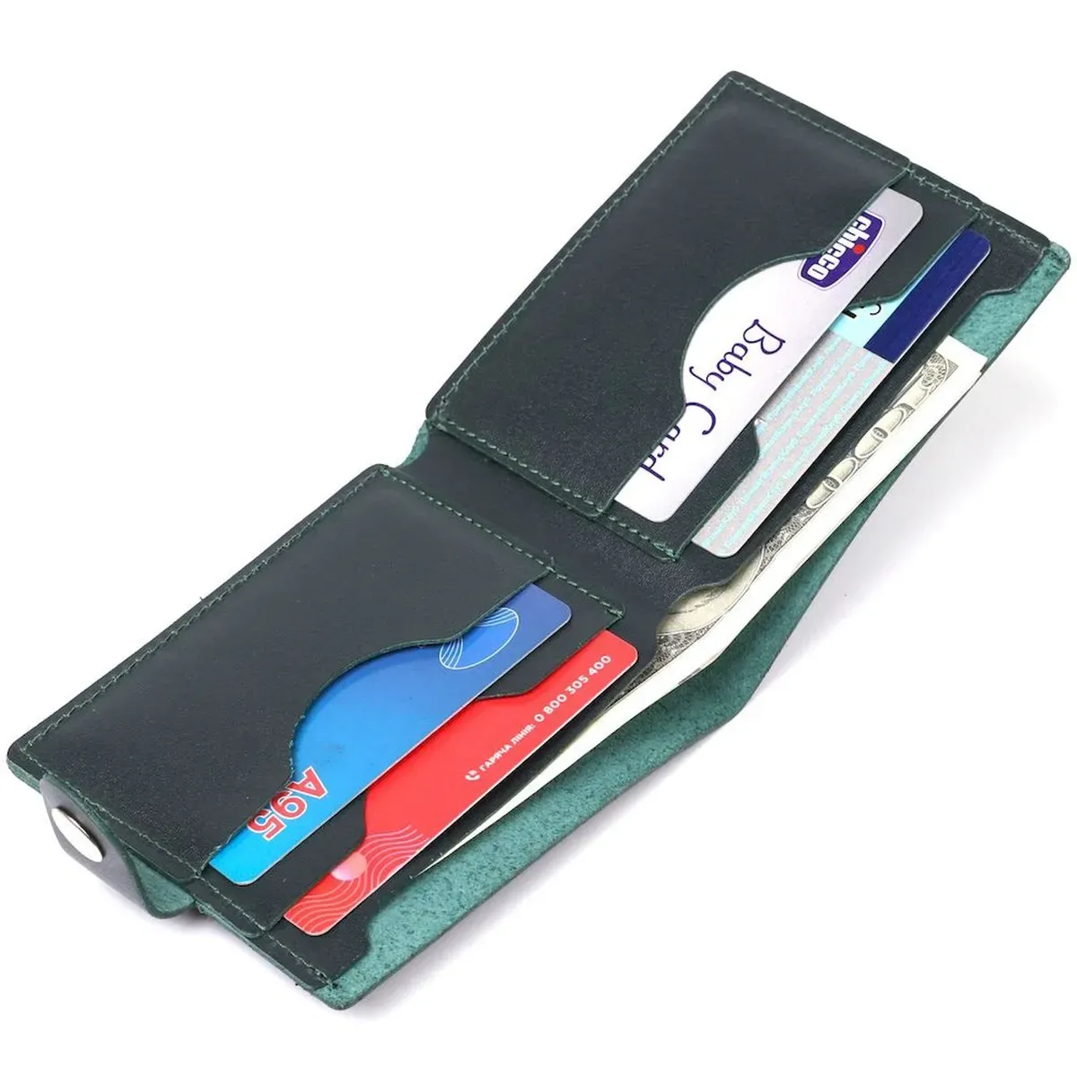 Элегантное портмоне в два сложения для стильных и современных людей. Материал изготовления – натуральная кожа высокой устойчивости к износу. Внутри расположено просторное отделение для купюр и четыре слота для пластиковых карточек. Цвет аксессуара – темно-зеленый, фактура гладкая и приятная на ощупь. Закрывается портмоне на хлястик с кнопкой.