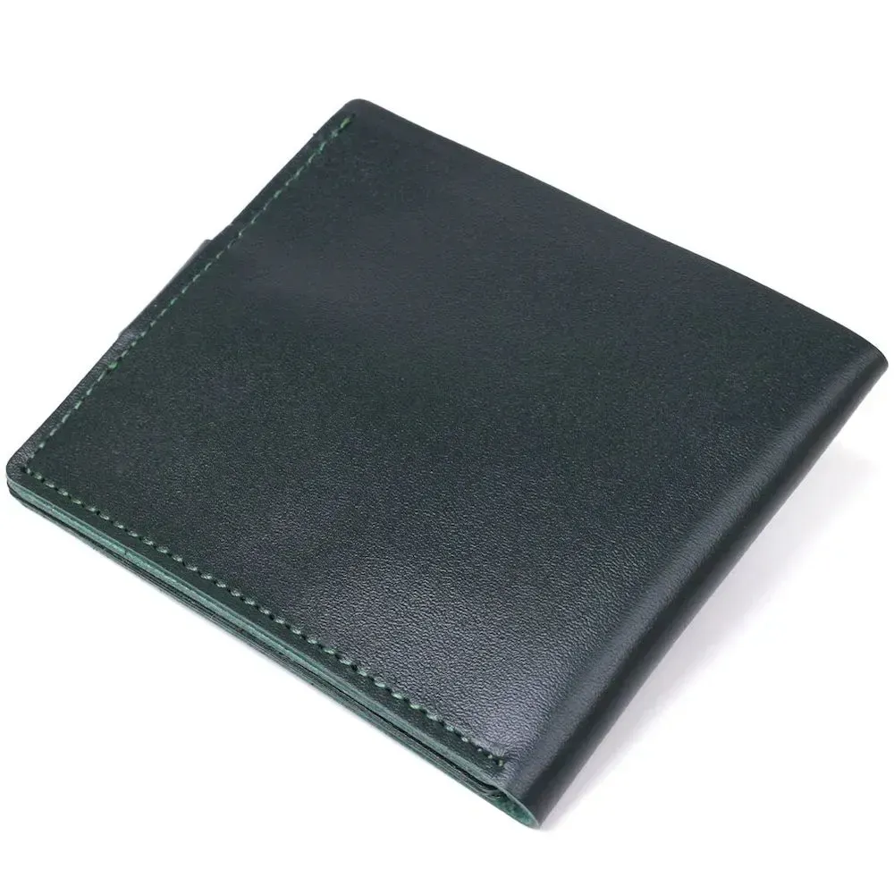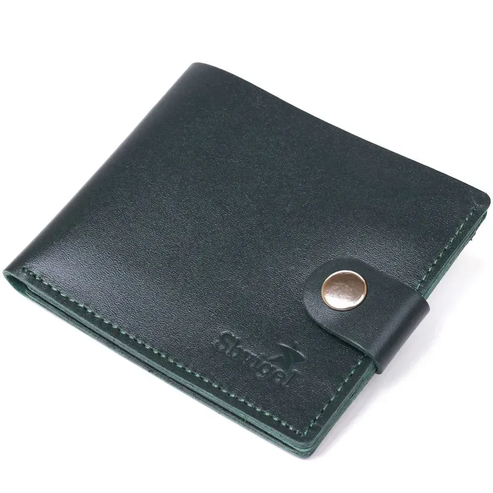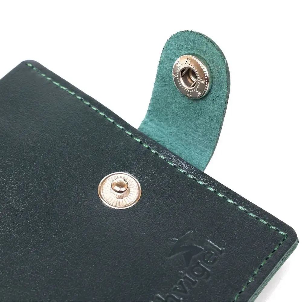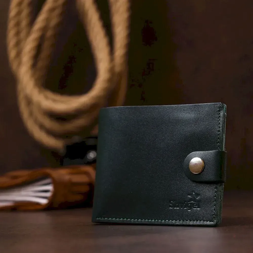 Элегантное портмоне в два сложения для стильных и современных людей. Материал изготовления – натуральная кожа высокой устойчивости к износу. Внутри расположено просторное отделение для купюр и четыре слота для пластиковых карточек. Цвет аксессуара – темно-зеленый, фактура гладкая и приятная на ощупь. Закрывается портмоне на хлястик с кнопкой.