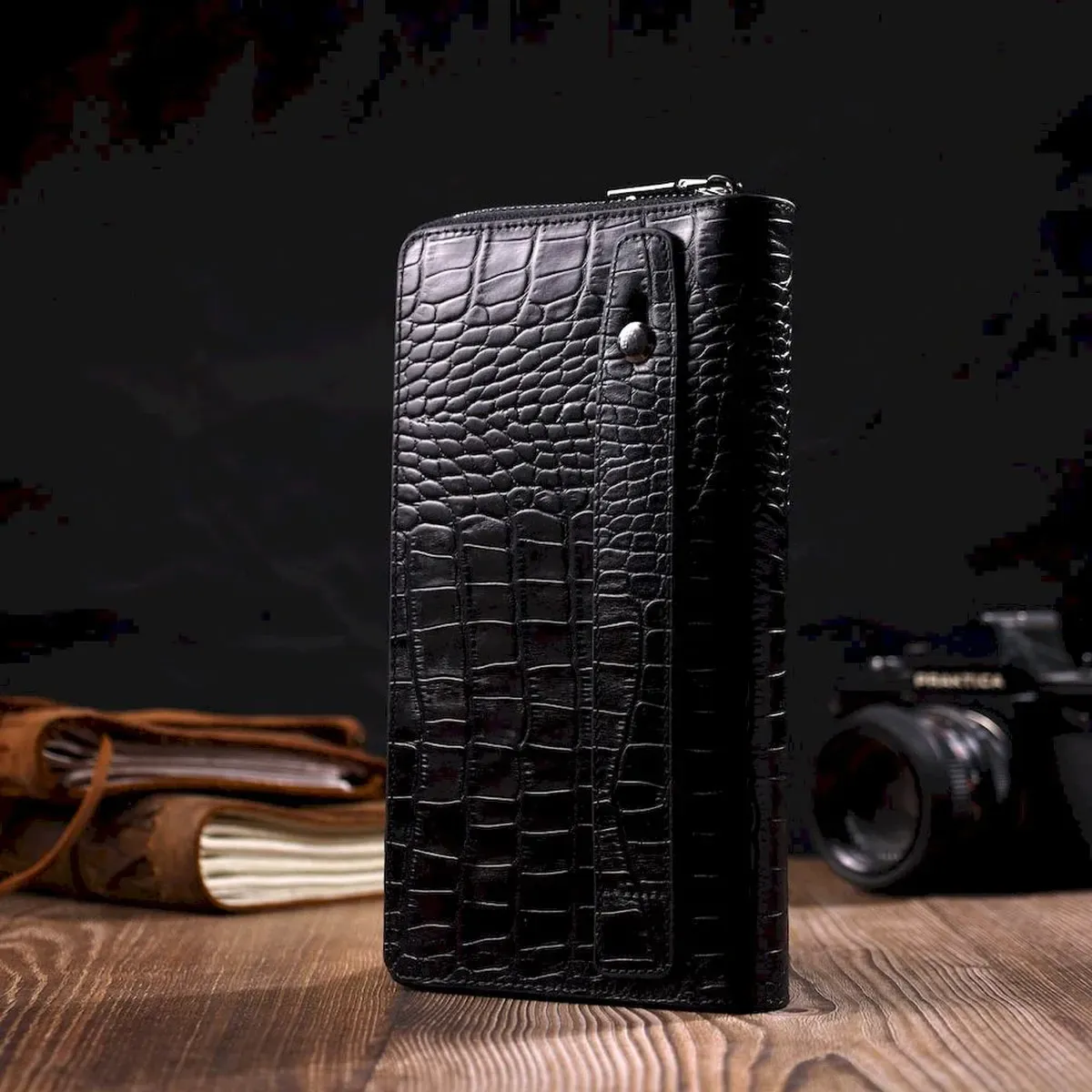 Удобный мужской клатч из натуральной кожи с тиснением под крокодила, кошелек закрывается на молнию, внутри можно без проблем размещать бумажные банкноты, банковские карты и даже смартфон. Аксессуар состоит из двух отделений для купюр, двух прилегающих карманов, семнадцати слотов для кредиток и монетницы на молнии. Имеется также ручка для ладони на тыльной стороне клатча. Продается бумажник в красивой коробке от производителя. Качественный и надежный клатч - именно такой аксессуар должен быть у каждого уважающего себя человека.