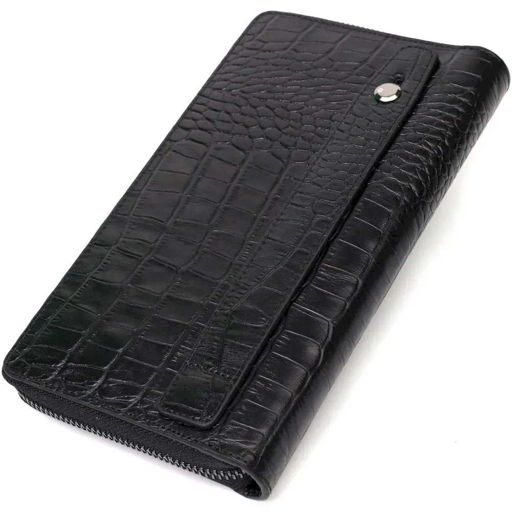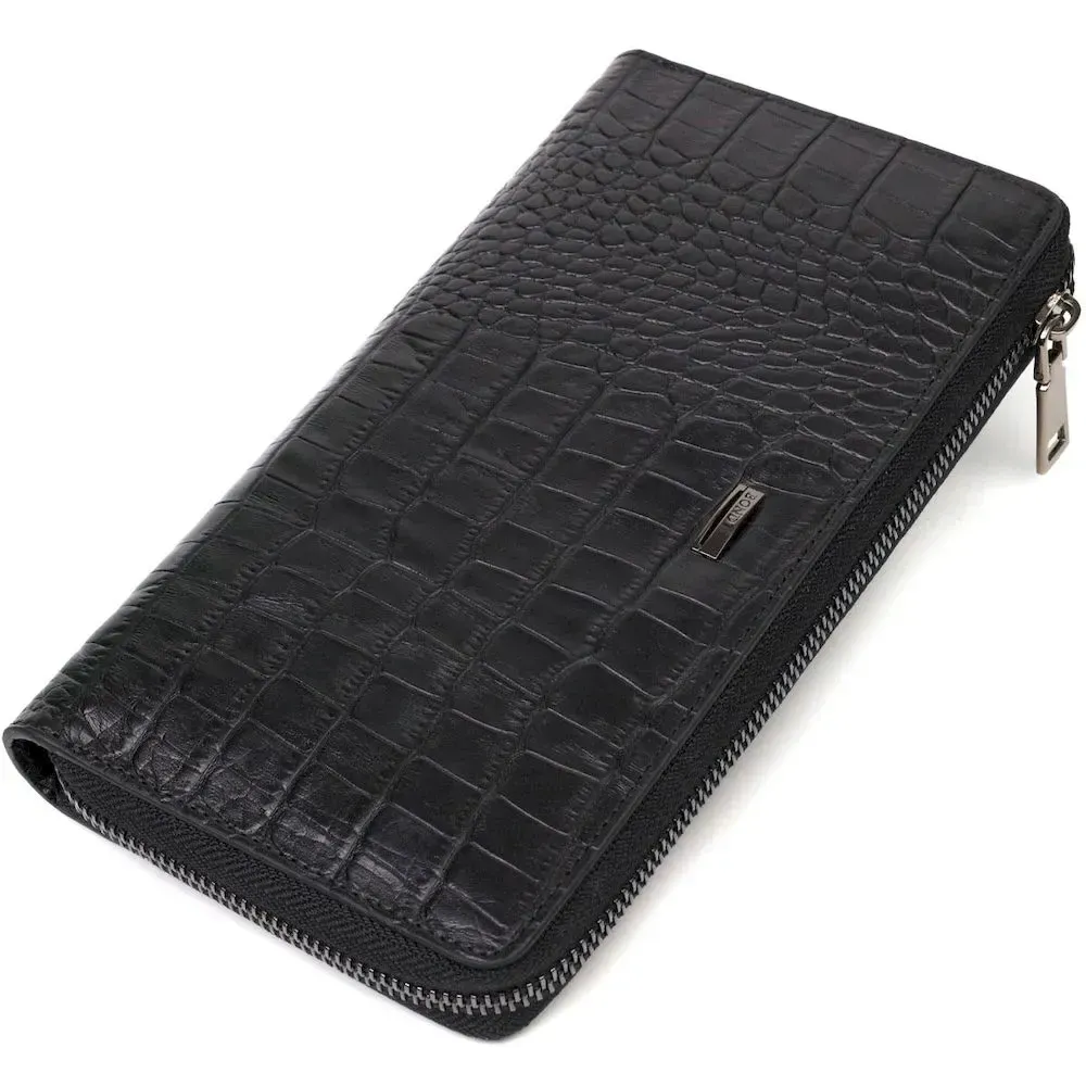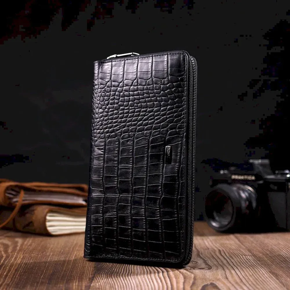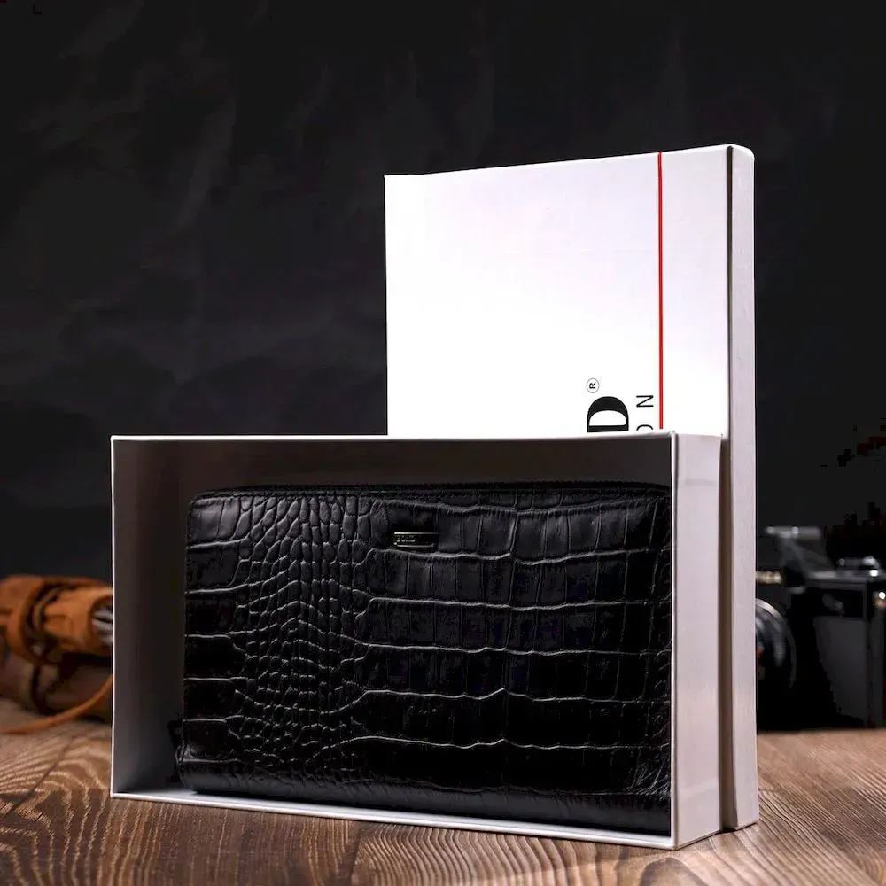 Добротный мужской клатч с одним отделением из натуральной кожи с тиснением под крокодила BOND 22030 Черный