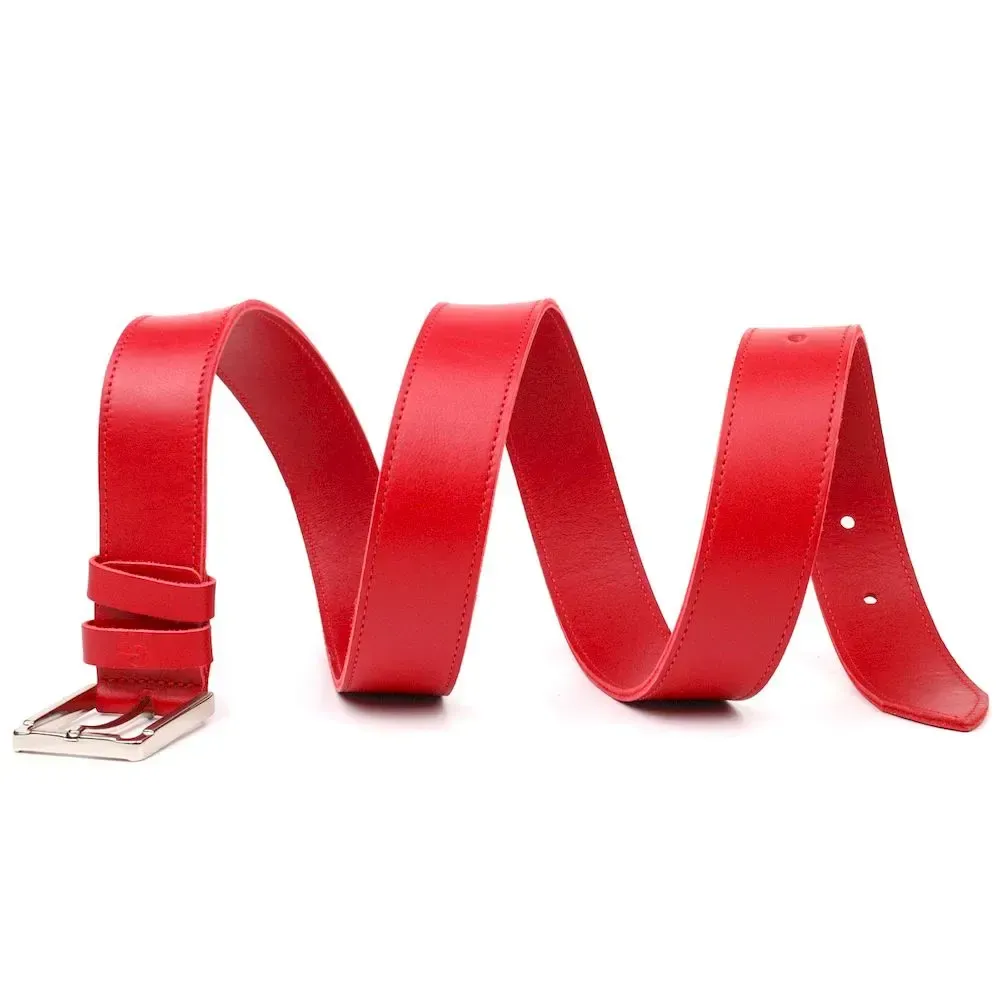 Стильный женский ремень из высококачественной итальянской кожи. Изделие прошито по краям ровной строчкой красного цвета, что придает ему стильного и изысканого вида. Аксессуар будет отлично сочетатся, как с брюками, так и с джинсами. Пряжка выполнена из качественной фурнитуры, с закругленными краями, очень аккуратная и стильная. Цвет пряжки: серебро. Тиснение логотипа бренда добавляет изделию стиля, а также служит залогом качества и оригинальности продукции. Кожаный ремень будет всегда актуальным подарком для себя, подруги или коллеги.
