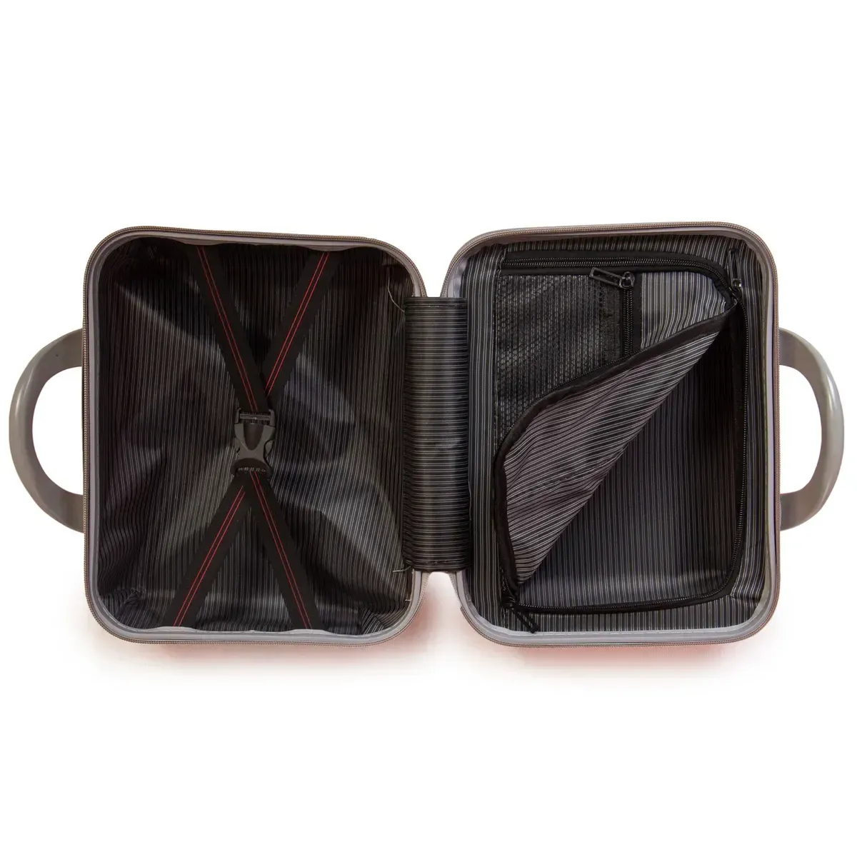 Пластиковый чемодан, выполненный из ударопрочного ABS пластика. Закрывается на молнию с кодовым замком. Объем чемодана можно увеличить используя молнию расширения (увеличивает глубину чемодана на 3см.). 4 полиуретановых двойных колеса с резиновой наружной частью. Внутри чемодана есть двойной отделение с карманом-перегородкой на молнии для мелких вещей и стяжки-резинки для фиксации багажа.