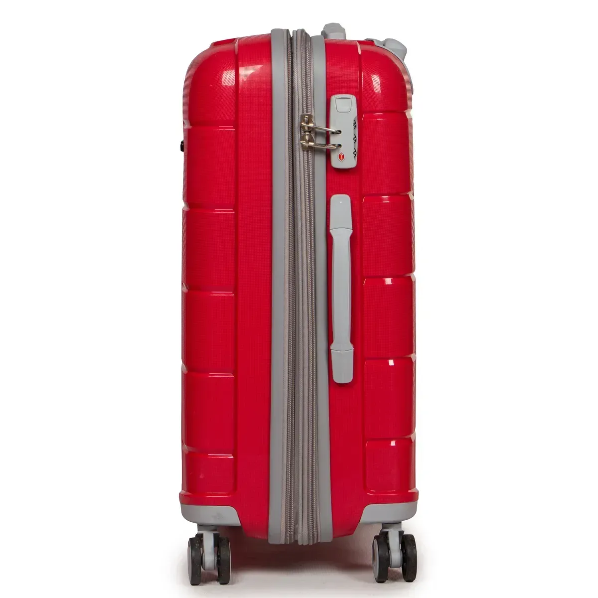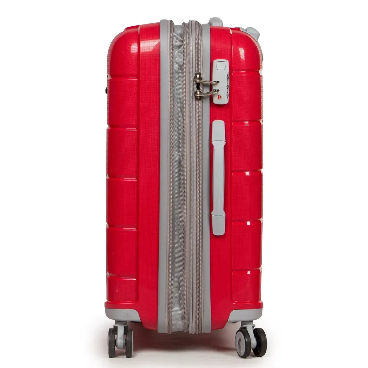 Пластиковый чемодан, выполненный из ударопрочного ABS пластика. Закрывается на молнию с кодовым замком. Объем чемодана можно увеличить используя молнию расширения (увеличивает глубину чемодана на 3см.). 4 полиуретановых двойных колеса с резиновой наружной частью. Внутри чемодана есть двойной отделение с карманом-перегородкой на молнии для мелких вещей и стяжки-резинки для фиксации багажа.