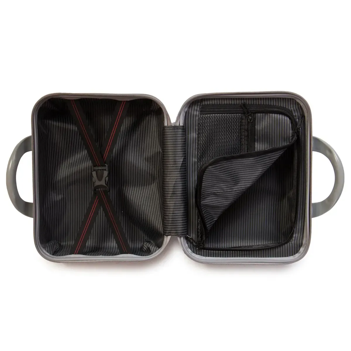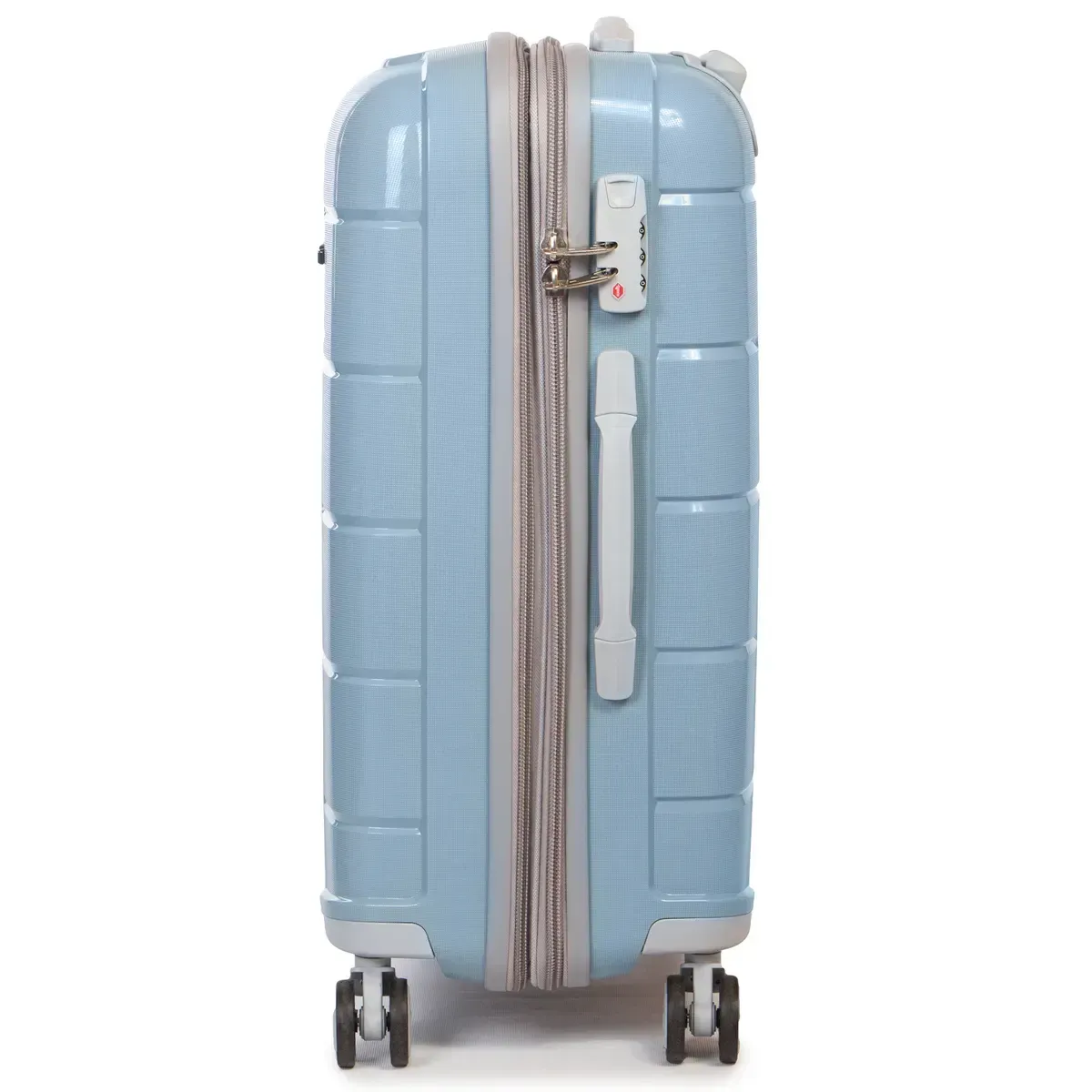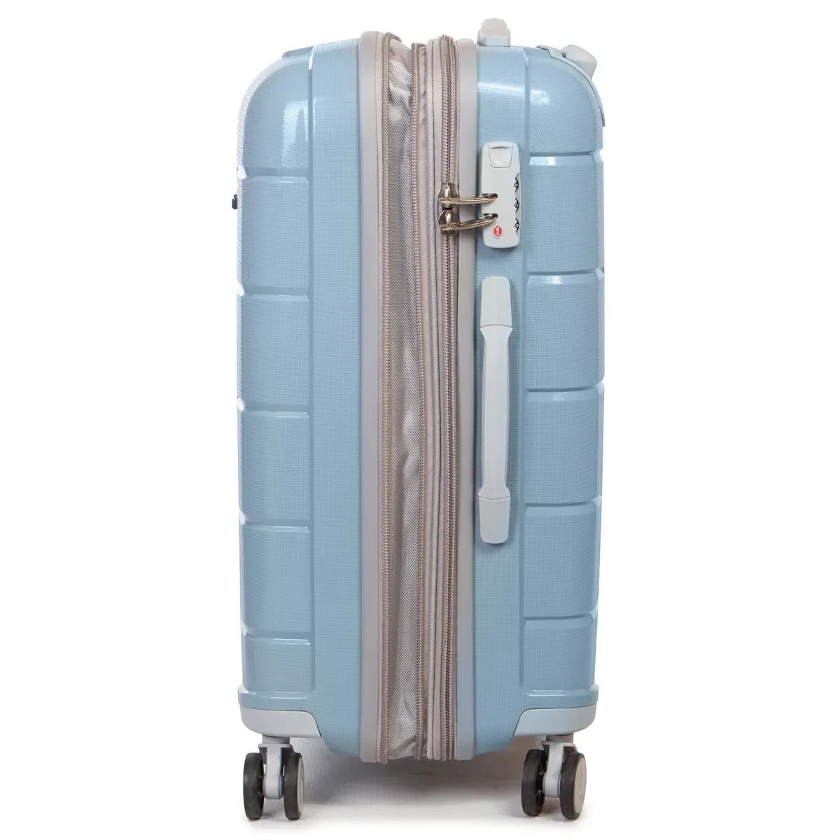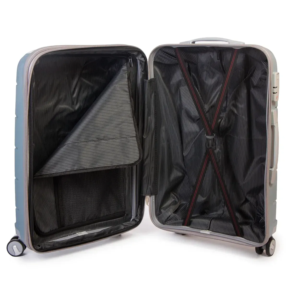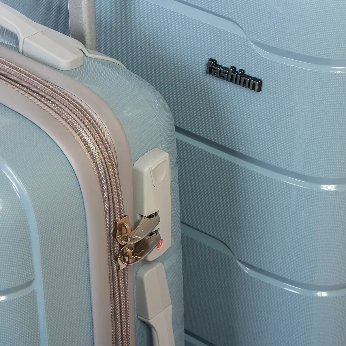 Пластиковый чемодан, выполненный из ударопрочного ABS пластика. Закрывается на молнию с кодовым замком. Объем чемодана можно увеличить используя молнию расширения (увеличивает глубину чемодана на 3см.). 4 полиуретановых двойных колеса с резиновой наружной частью. Внутри чемодана есть двойной отделение с карманом-перегородкой на молнии для мелких вещей и стяжки-резинки для фиксации багажа.