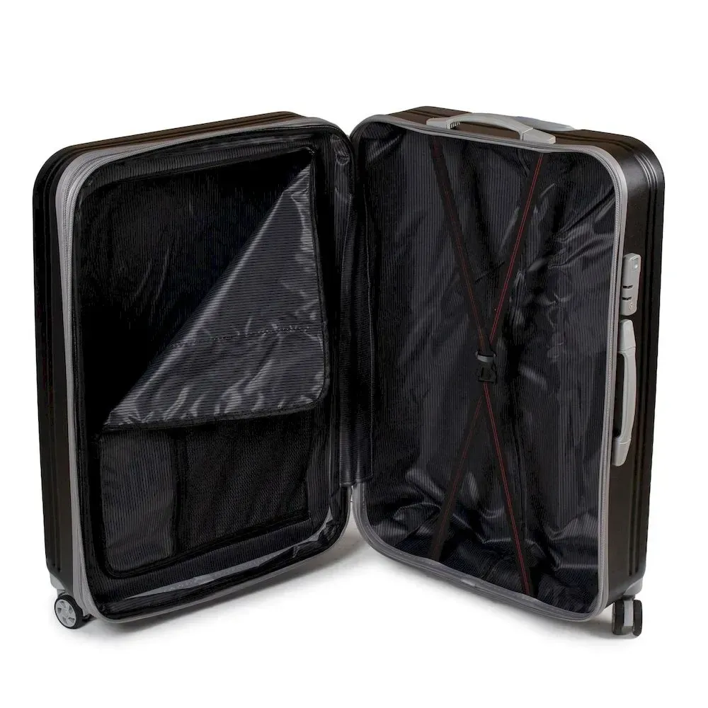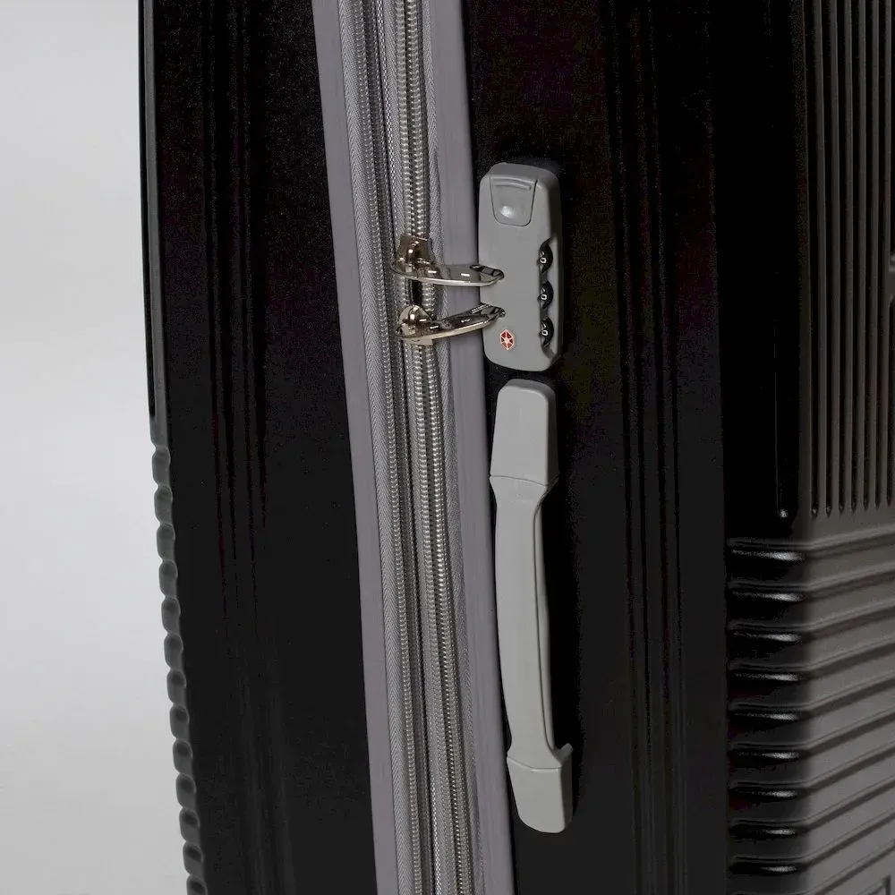 Пластиковый чемодан, выполненный из ударопрочного ABS пластика. Закрывается на молнию с кодовым замком. Объем чемодана можно увеличить используя молнию расширения (увеличивает глубину чемодана на 3см.). 4 полиуретановых двойных колеса. Внутри чемодана есть двойной отделение с карманом-перегородкой на молнии для мелких вещей и стяжки-резинки для фиксации багажа.