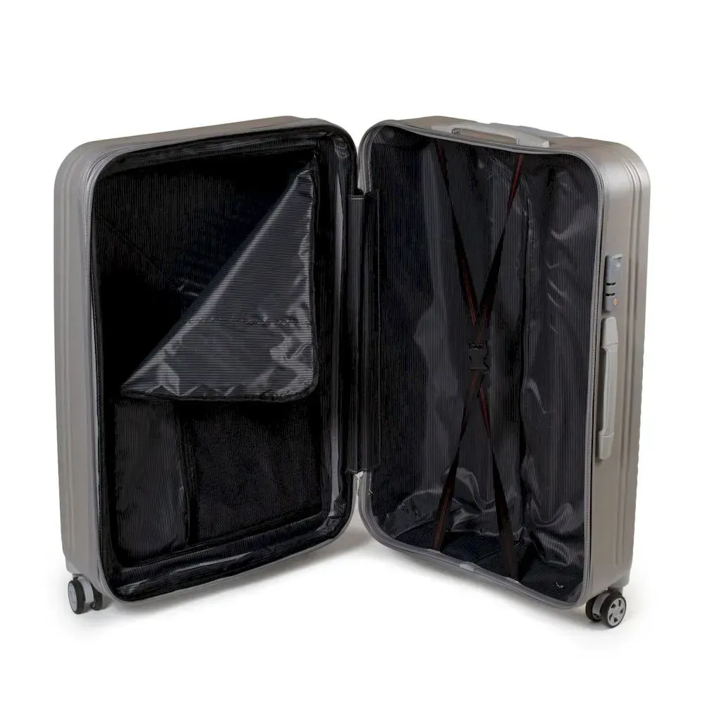 Пластиковый чемодан, выполненный из ударопрочного ABS пластика. Закрывается на молнию с кодовым замком. Объем чемодана можно увеличить используя молнию расширения (увеличивает глубину чемодана на 3см.). 4 полиуретановых двойных колеса. Внутри чемодана есть двойной отделение с карманом-перегородкой на молнии для мелких вещей и стяжки-резинки для фиксации багажа.