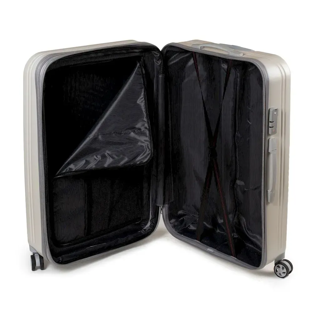 Пластиковый чемодан, выполненный из ударопрочного ABS пластика. Закрывается на молнию с кодовым замком. Объем чемодана можно увеличить используя молнию расширения (увеличивает глубину чемодана на 3см.). 4 полиуретановых двойных колеса. Внутри чемодана есть двойной отделение с карманом-перегородкой на молнии для мелких вещей и стяжки-резинки для фиксации багажа.