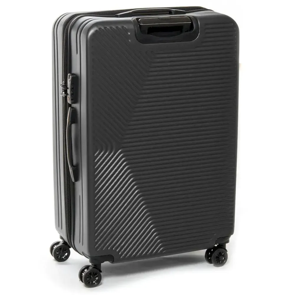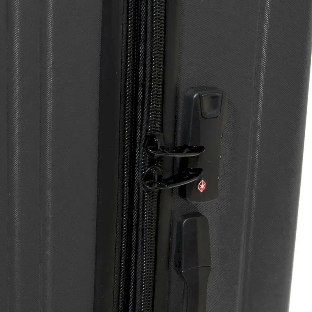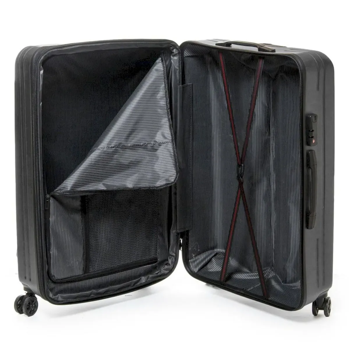 Пластиковый чемодан, выполненный из ударопрочного ABS пластика. Закрывается на молнию с кодовым замком. Объем чемодана можно увеличить используя молнию расширения (увеличивает глубину чемодана на 3см.). 4 полиуретановых двойных колеса. Внутри чемодана есть двойной отделение с карманом-перегородкой на молнии для мелких вещей и стяжки-резинки для фиксации багажа.