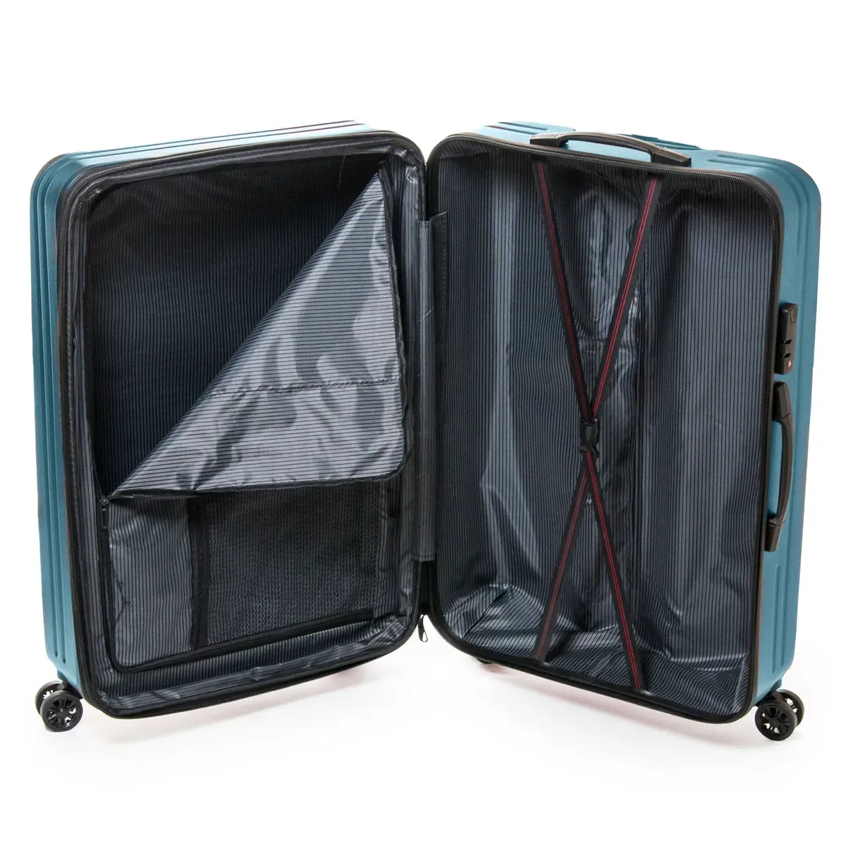 Пластиковый чемодан, выполненный из ударопрочного ABS пластика. Закрывается на молнию с кодовым замком. Объем чемодана можно увеличить используя молнию расширения (увеличивает глубину чемодана на 3см.). 4 полиуретановых двойных колеса. Внутри чемодана есть двойной отделение с карманом-перегородкой на молнии для мелких вещей и стяжки-резинки для фиксации багажа.