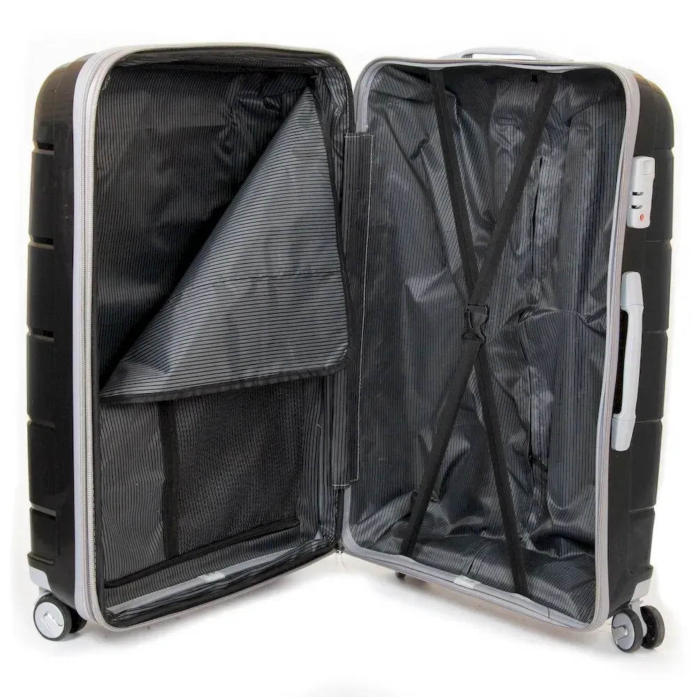 Пластиковый чемодан, выполненный из ударопрочного ABS пластика. Закрывается на молнию с кодовым замком. Объем чемодана можно увеличить используя молнию расширения (увеличивает глубину чемодана на 3см.). 4 полиуретановых двойных колеса с резиновой наружной частью. Внутри чемодана есть двойной отделение с карманом-перегородкой на молнии для мелких вещей и стяжки-резинки для фиксации багажа.
