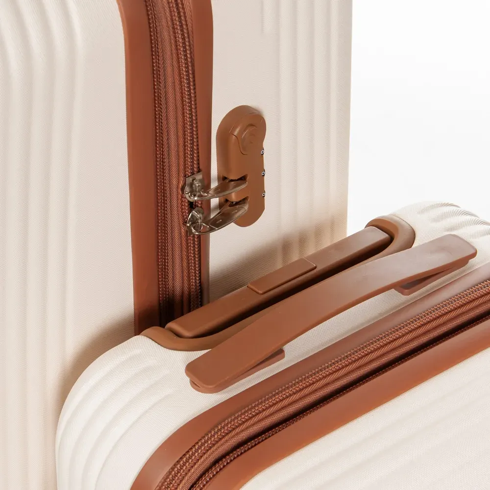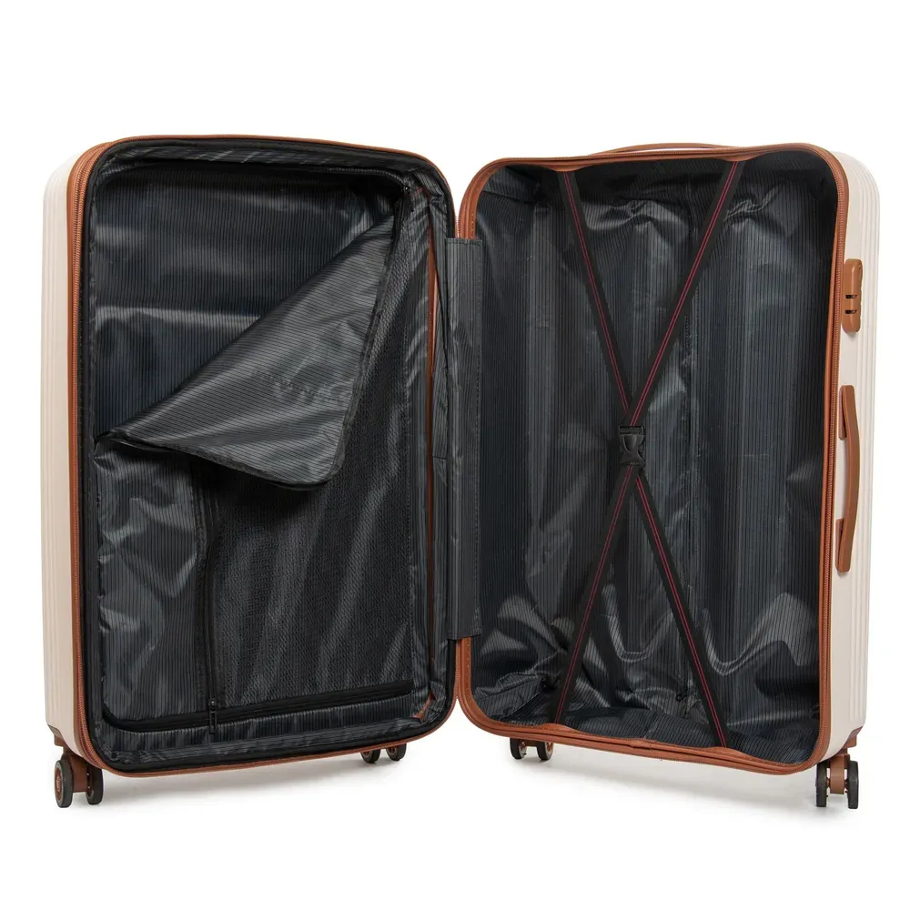 Пластиковый чемодан, выполненный из ударопрочного ABS пластика. Закрывается на молнию с кодовым замком. Объем чемодана можно увеличить используя молнию расширения (увеличивает глубину чемодана на 3см.). 4 полиуретановых двойных колеса. Внутри чемодана есть двойной отделение с карманом-перегородкой на молнии для мелких вещей и стяжки-резинки для фиксации багажа.
