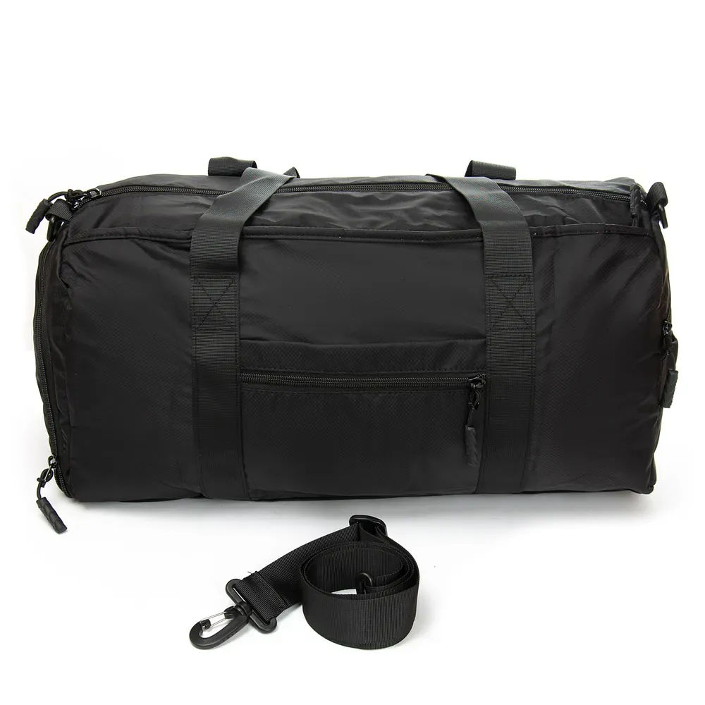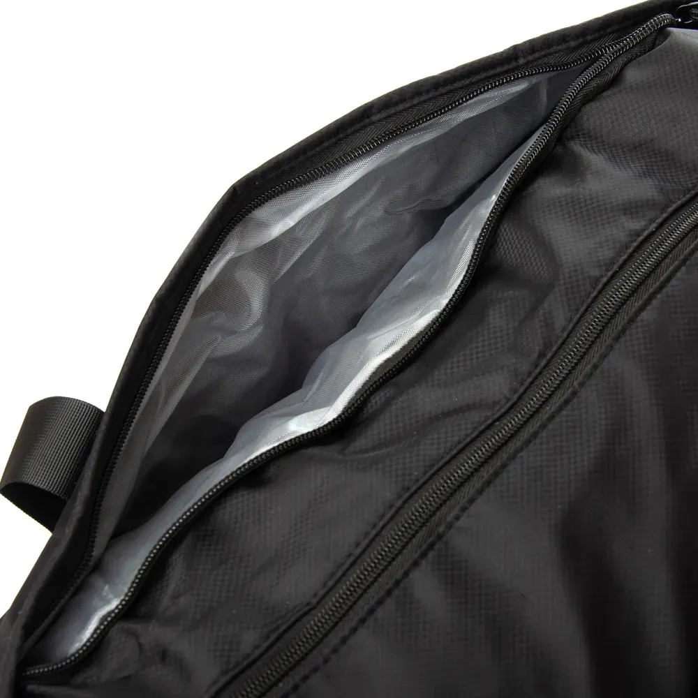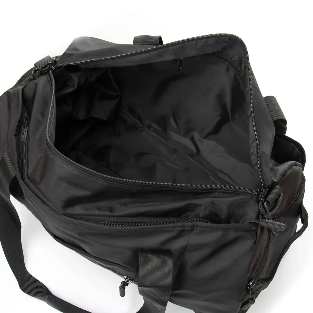 Одно отделение, закрывается на молнию. Внутри отделения есть большой боковой карман на молнии. Снаружи также расположен большой карман-отделение на молнии с герметичной подкладкой. На фасаде находятся три открытых кармана. На обратной стороне расположен карман на молнии и крепление на ручку чемодана. На торцах сумки есть два кармана на молнии, один из которых предназначен для обуви.