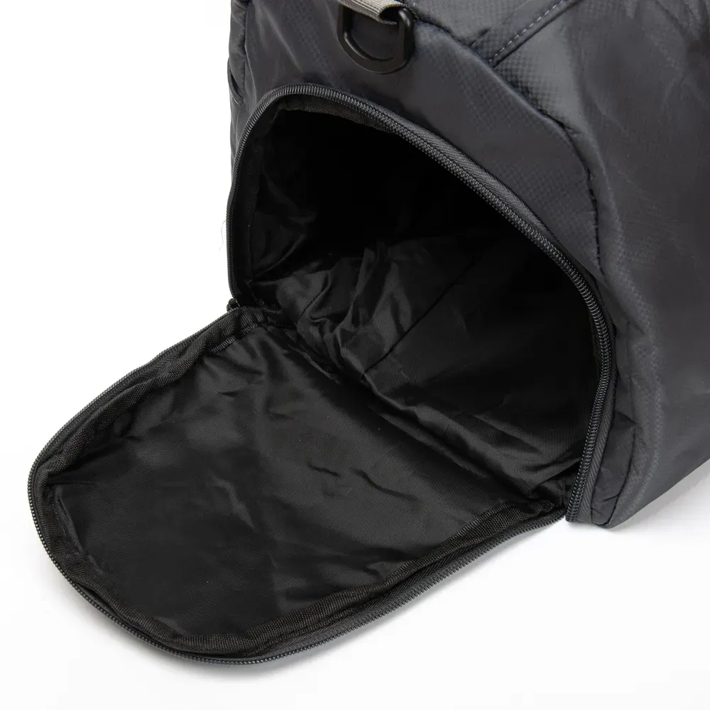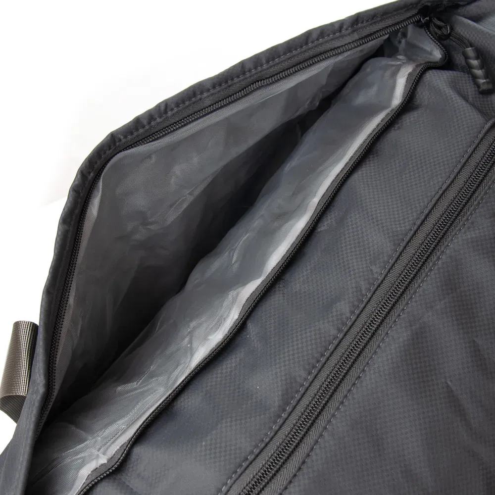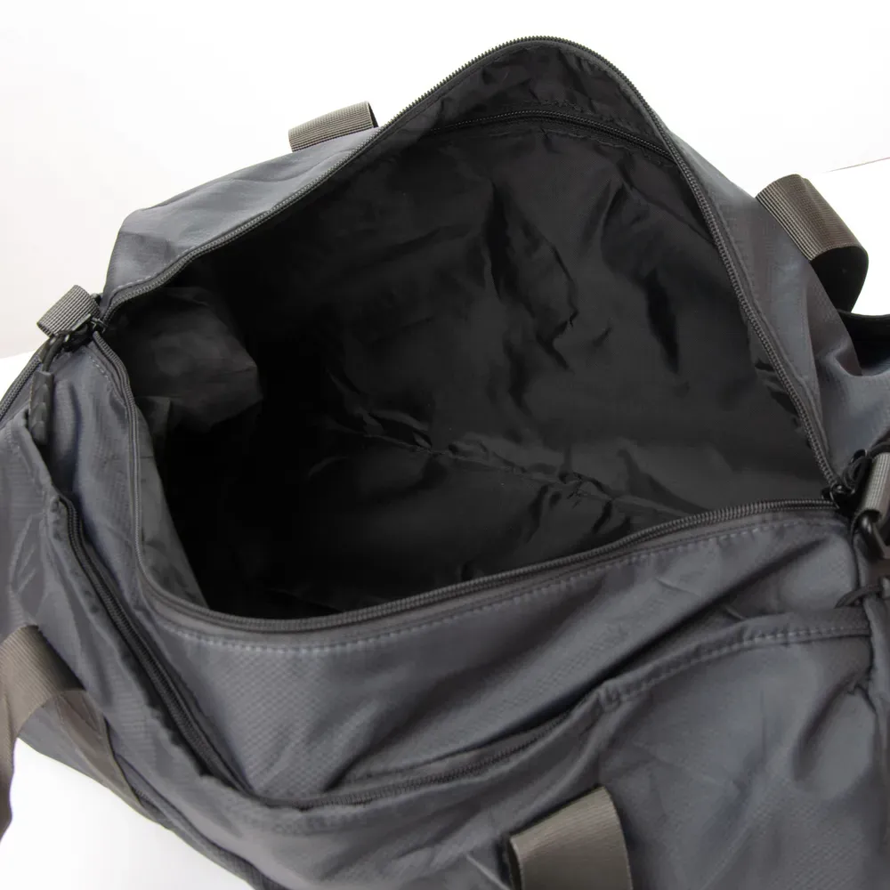 Одно отделение, закрывается на молнию. Внутри отделения есть большой боковой карман на молнии. Снаружи также расположен большой карман-отделение на молнии с герметичной подкладкой. На фасаде находятся три открытых кармана. На обратной стороне расположен карман на молнии и крепление на ручку чемодана. На торцах сумки есть два кармана на молнии, один из которых предназначен для обуви.