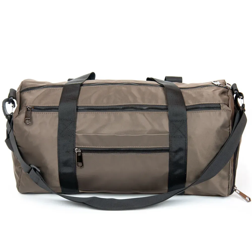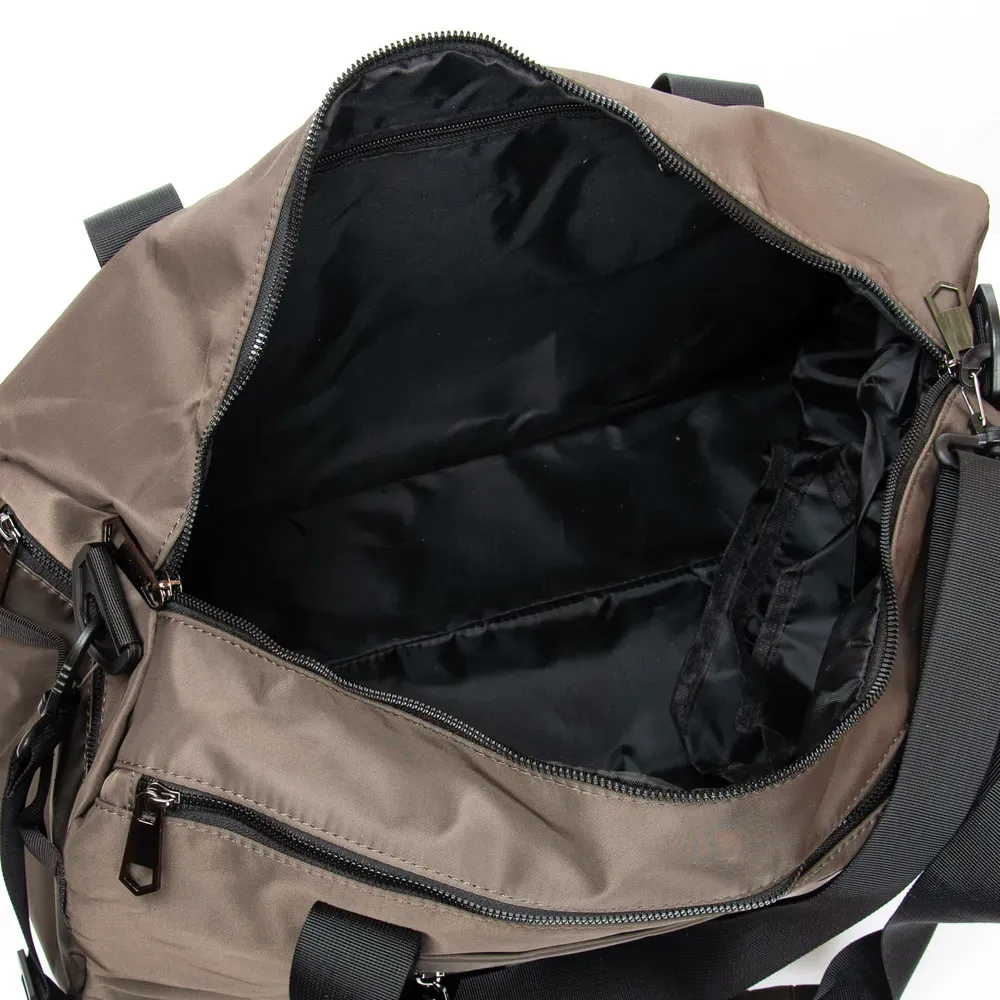 Одно основное отделение, закрывается на молнию. Внутри отделения есть боковой карман на молнии. Дополнительное отделение с герметичной подкладкой предназначено для влажных вещей. На торцах сумки расположены карманы на молнии, один из них предназначен для обуви. На обратной стороне сумки есть крепление на ручку чемодана и карман на молнии.