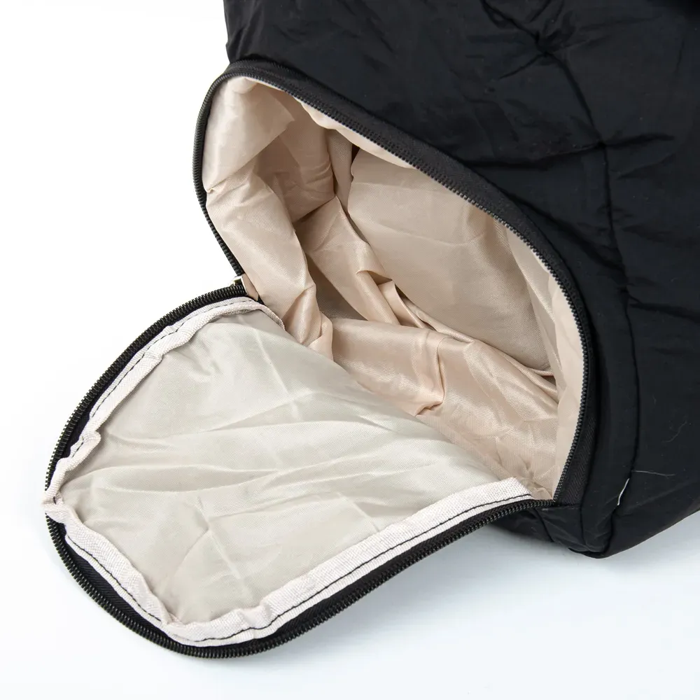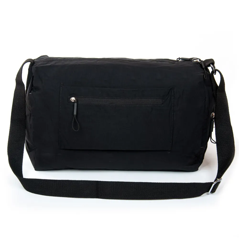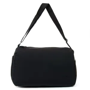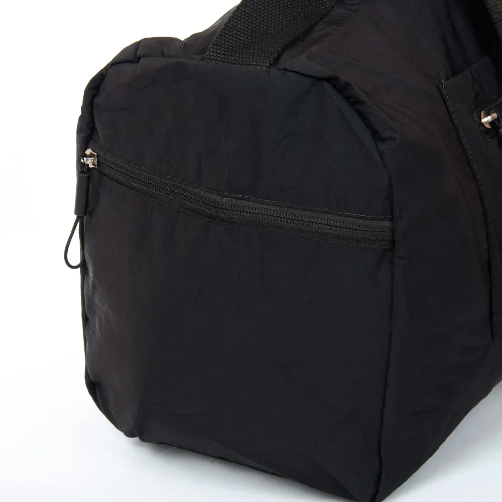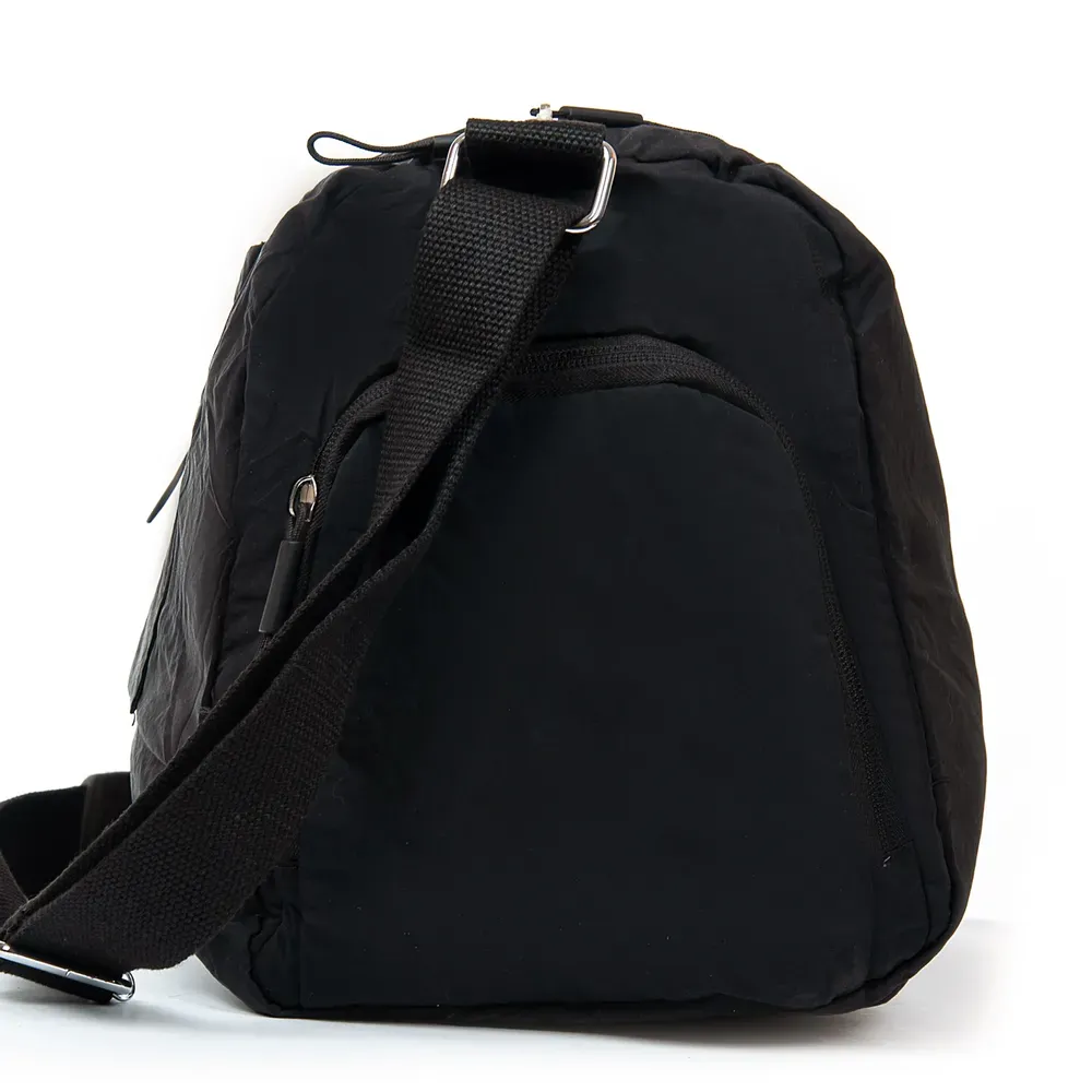 Одно отделение, закрывается на молнию. Внутри отделения есть большой карман на молнии и открытый двойной карман. Снаружи сумки на торцах расположены два кармана на молнии. Один из них предназначен для обуви. На обратной стороне также есть карман на молнии и крепление на ручку чемодана.