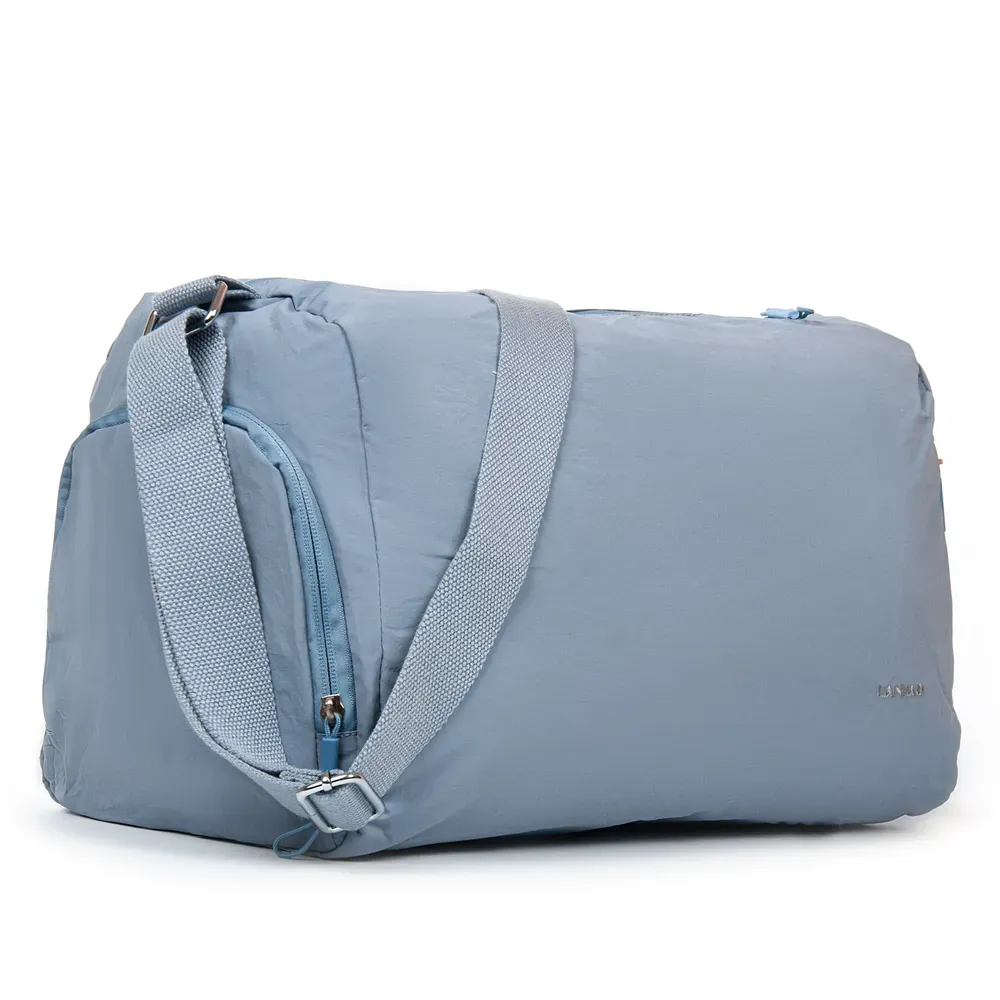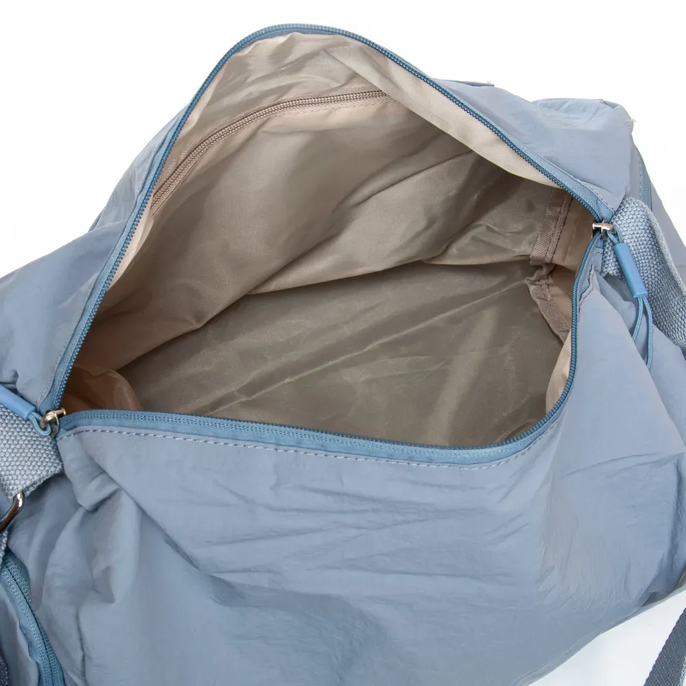 Одно отделение, закрывается на молнию. Внутри отделения есть большой карман на молнии и открытый двойной карман. Снаружи сумки на торцах расположены два кармана на молнии. Один из них предназначен для обуви. На обратной стороне также есть карман на молнии и крепление на ручку чемодана.