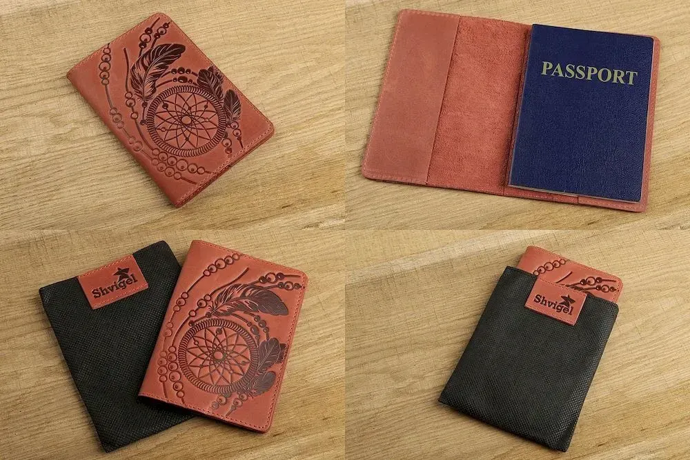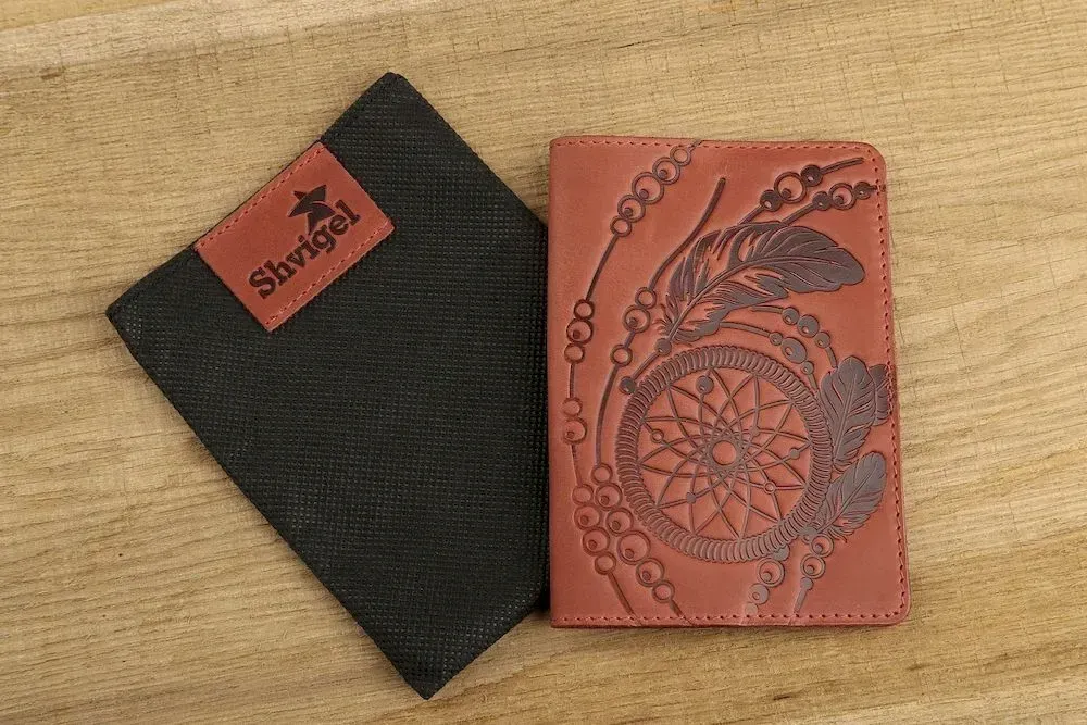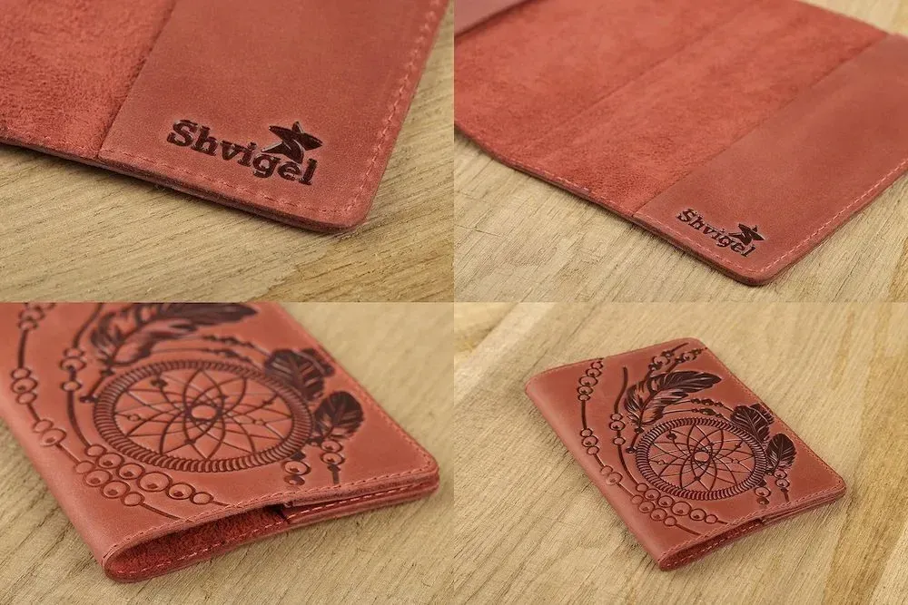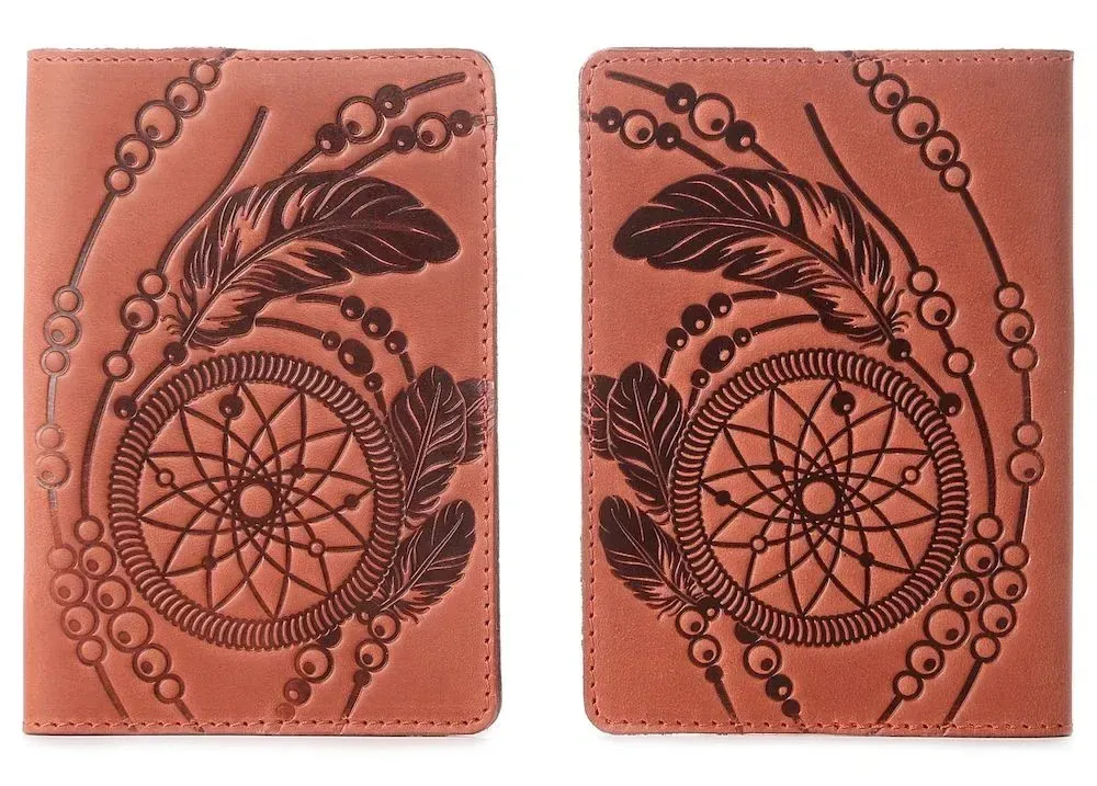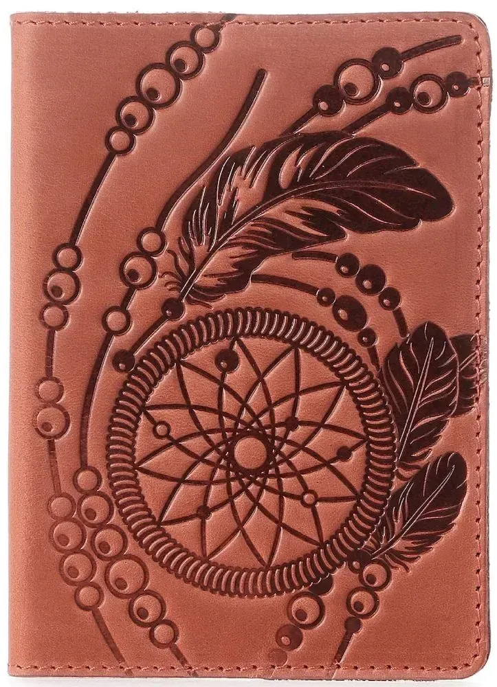 Отличная обложка на паспорт с эксклюзивным дизайнерским рисунком на лицевой стороне, который называется Ловец Снов (dreamcatcher). Это индейский амулет, который символизирует защиту спящего человека от злых духов. Аксессуар выполнен из натуральной, высококачественной винтажной кожи. Данная обложка на паспорт упакована в красивый, фирменный текстильный мешочек.