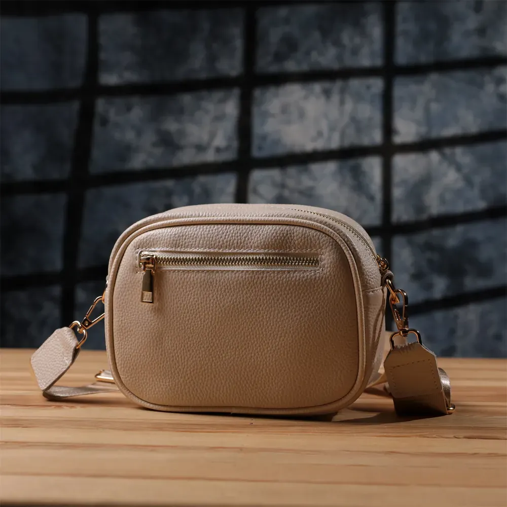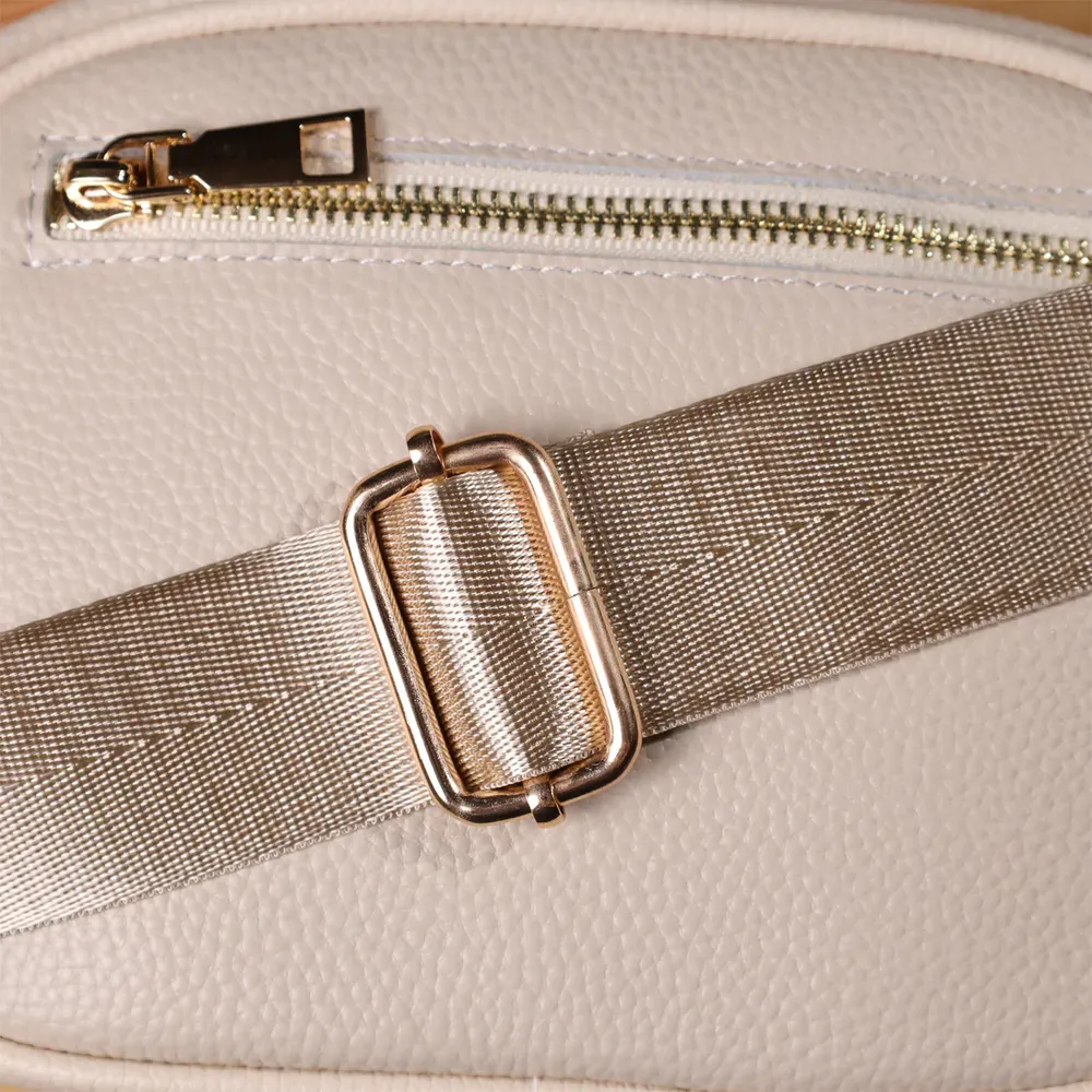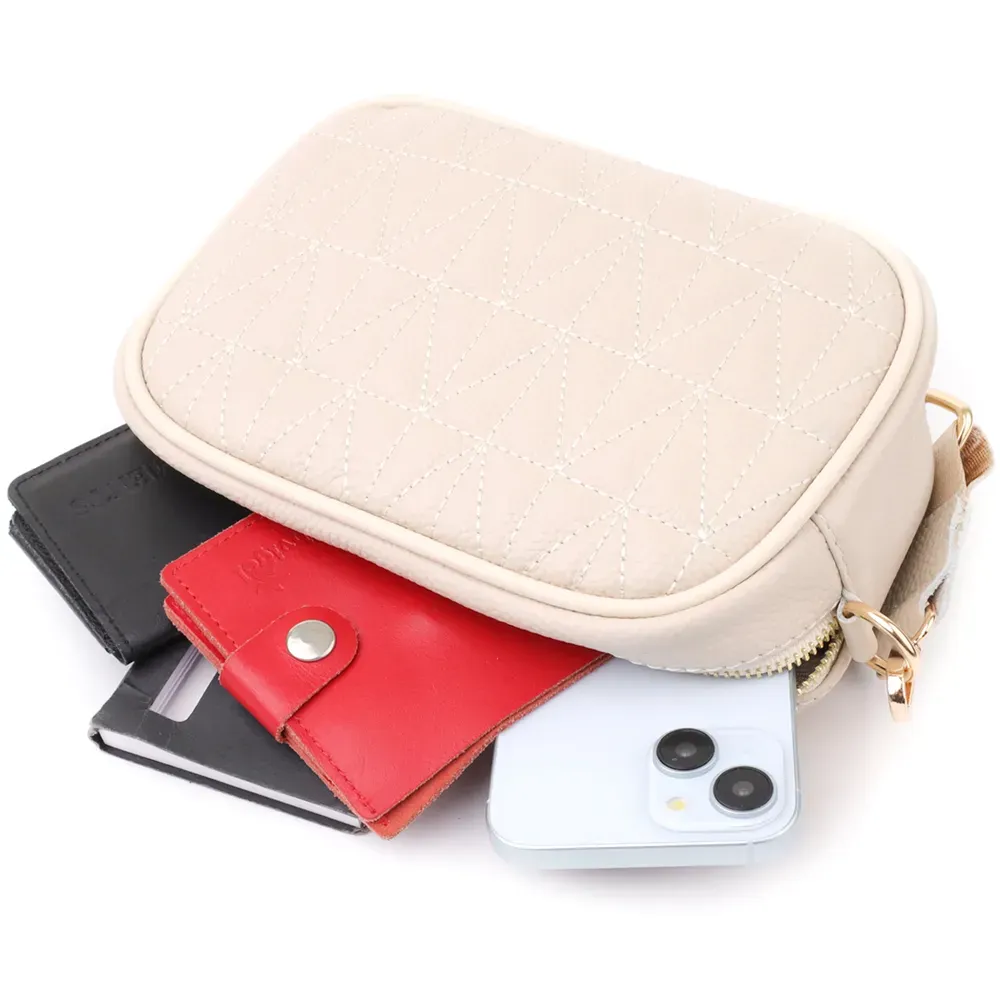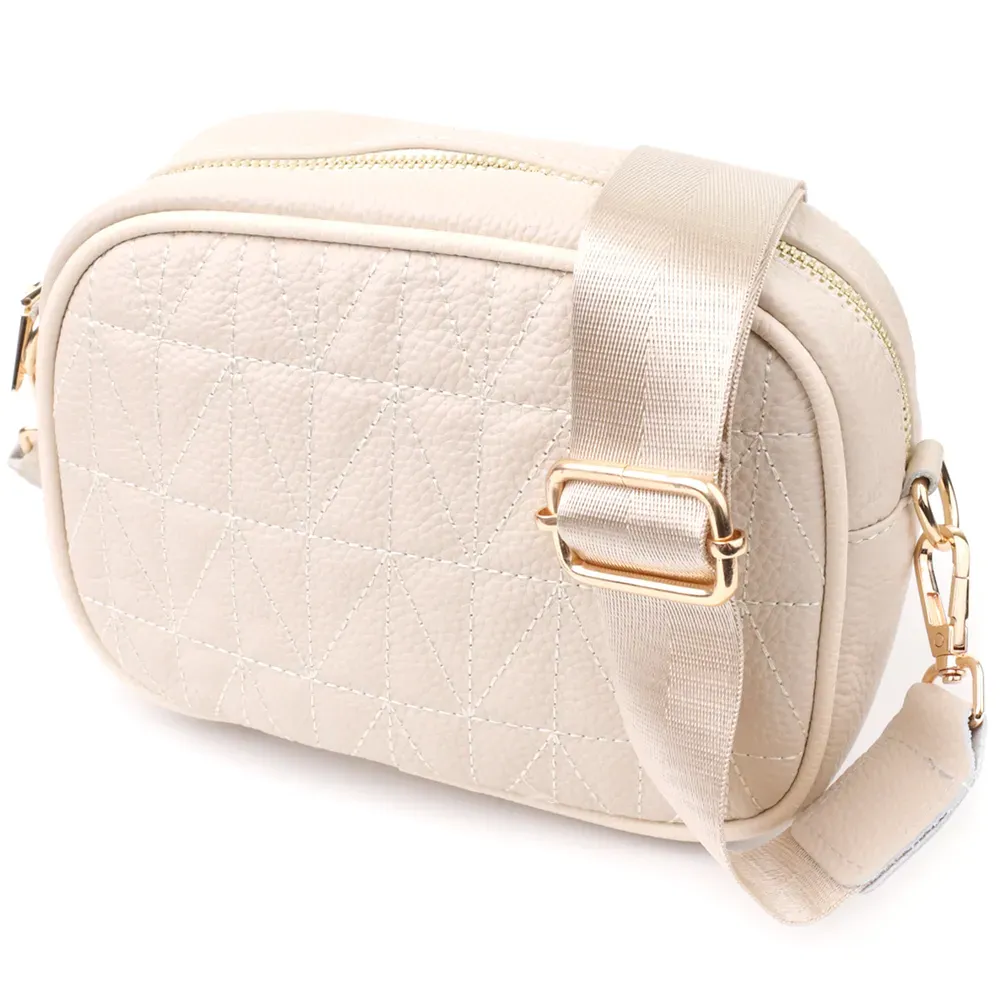 Сумка жіноча в ніжному білому кольорі з натуральної шкіри стане елегантним і вишуканим акцентом вашого образу. М'яка, але щільна шкіра приємна на дотик і підкреслює високу якість виробу. Компактна чітка форма робить модель акуратною та зручною, а стібка на лицьовій стороні додає витонченого дизайнерського характеру. Сумка закривається на блискавку, всередині розташоване основне відділення з кишенею на блискавці та відкритою кишенею для дрібниць, а на тильній стороні є зовнішня кишеня на блискавці для швидкого доступу до потрібних речей. Знімний текстильний ремінь, що регулюється, забезпечує комфорт при носінні, а фурнітура під жовте золото гармонійно відтіняє світлий білий тон шкіри. Ця сумка стане універсальним аксесуаром для повсякденних виходів та особливих випадків, підкреслюючи витончений смак та любов до якісних матеріалів.