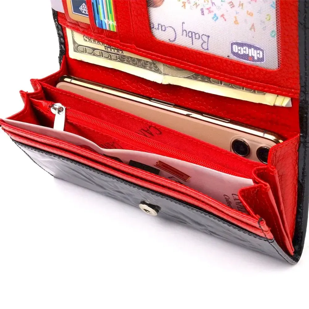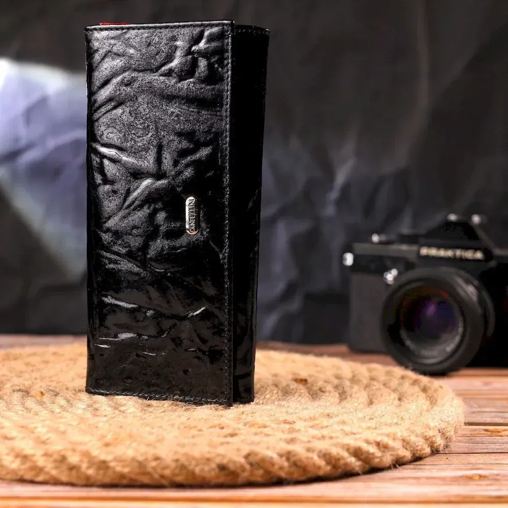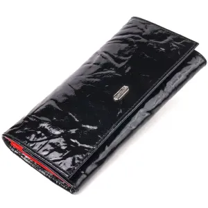 Женский лакированный кошелек, из натуральной фактурной кожи, в черном цвете снаружи и в красном - внутри. Аксессуар имеет три широких отделения для купюр, с двумя перегородками, одна перегородка закрывается на молнию, вместительную монетницу снаружи, три скрытых кармана и шесть карманов для карточек. Закрывается аксессуар клапаном на кнопку. Если Вы хотите порадовать и себя и удивить близких, то непеременно покупайте кожаные аксессуары в нашем магазине, качество и цена Вас однозначно порадует.