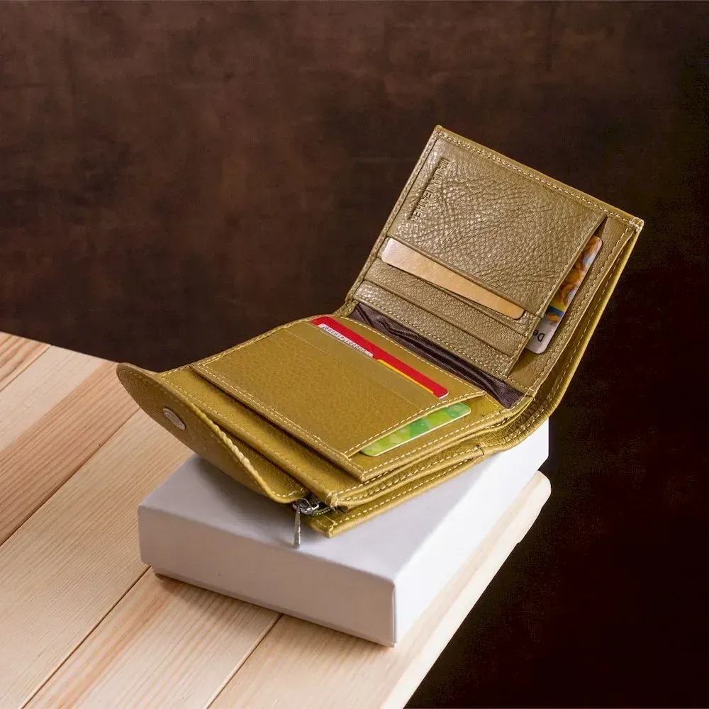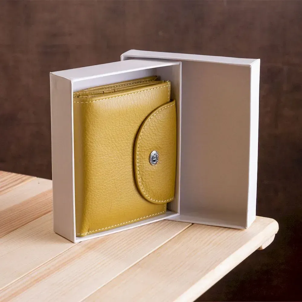 Замечательное женское портмоне для тех, кто не любит большие и громоздкие кошельки. Выполнено из первоклассной натуральной кожи высокого качества с идеальными эксплуатационными характеристиками. Цвет изделия – горчичный, смотрится очень экстравагантно и необычно. Данная модель отлично соединяет в себе такие понятия, как компактность и вместительность. Аксессуар имеет достаточное количество отделений и карманов для всех необходимых вещей, которые нужно носить с собой в повседневной жизни. Этот превосходный бумажник станет для Вас просто незаменимым. Упаковано портмоне в картонную белую коробку.