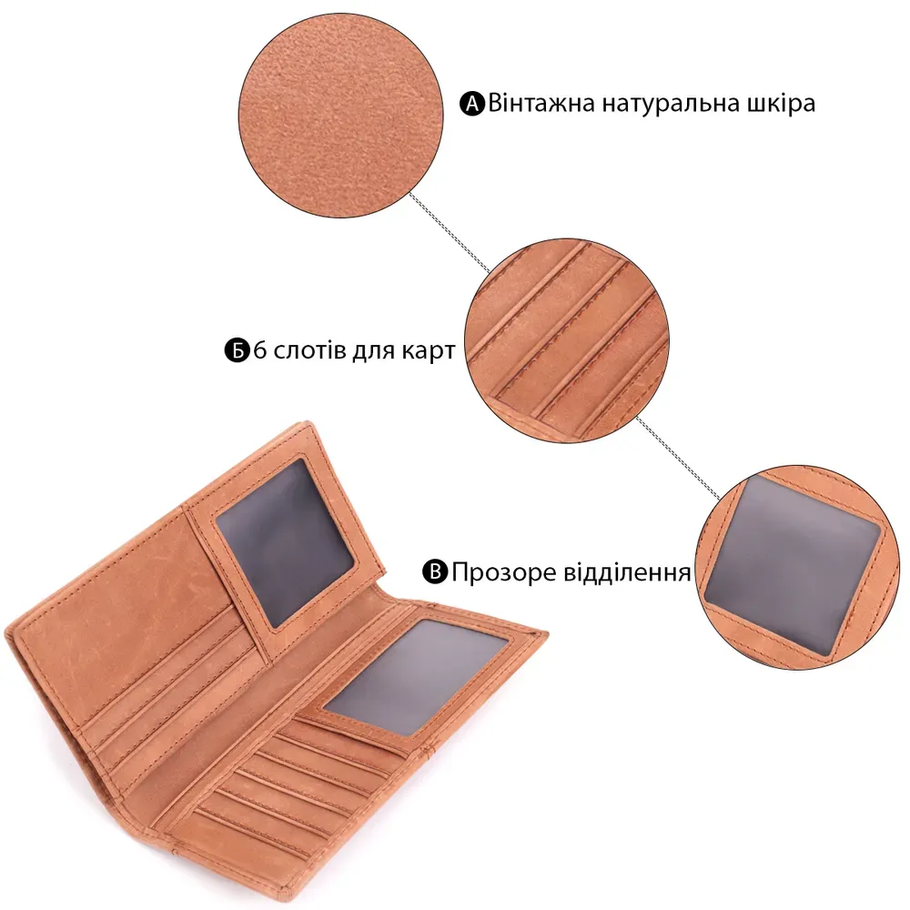 Стильний гаманець унісекс із якісної натуральної вінтажної шкіри, в гарному кольорі. Модель має одну секцію для зберігання купюр, які не складаються при використанні аксесуара, шість слотів для кредитних карток, дві кишені під плівкою, монетницю на блискавці, а також дві прилеглі кишені. Такий гаманець із вінтажної шляхетної шкіри – це ідеальний варіант для тих, хто цінує якість, зручність та комфорт.