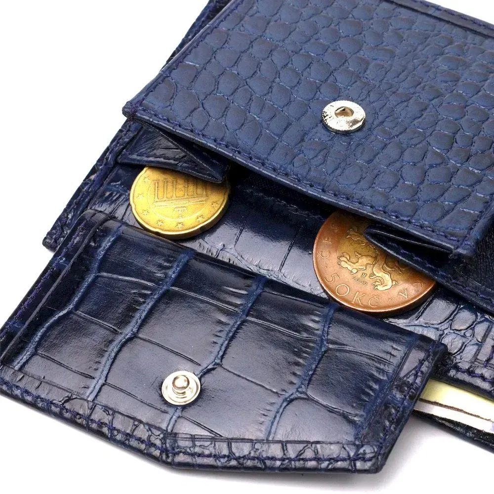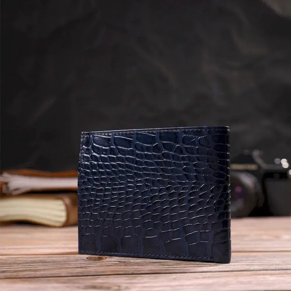 Красивый мужской кошелек из натуральной фактурной кожи, с тиснением под крокодила. Аксессуар имеет одно основное отделение с тканевой перегородкой в которое помещаются купюры всех номиналов, три кармана для карточек, два прилегающих кармана и монетницу. Закрывается аксессуар пополам, без застежки. На лицевой стороне, в правом нижнем углу металлический логотип компании производителя. Приобретая кожаный аксессуар этой фирмы, себе или на подарок, будьте уверены, что он прослужит Вам не один год.