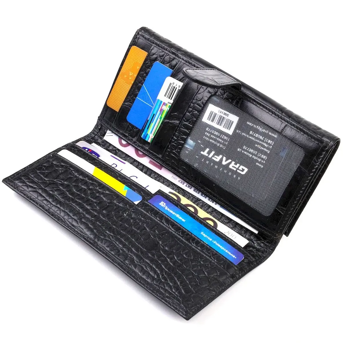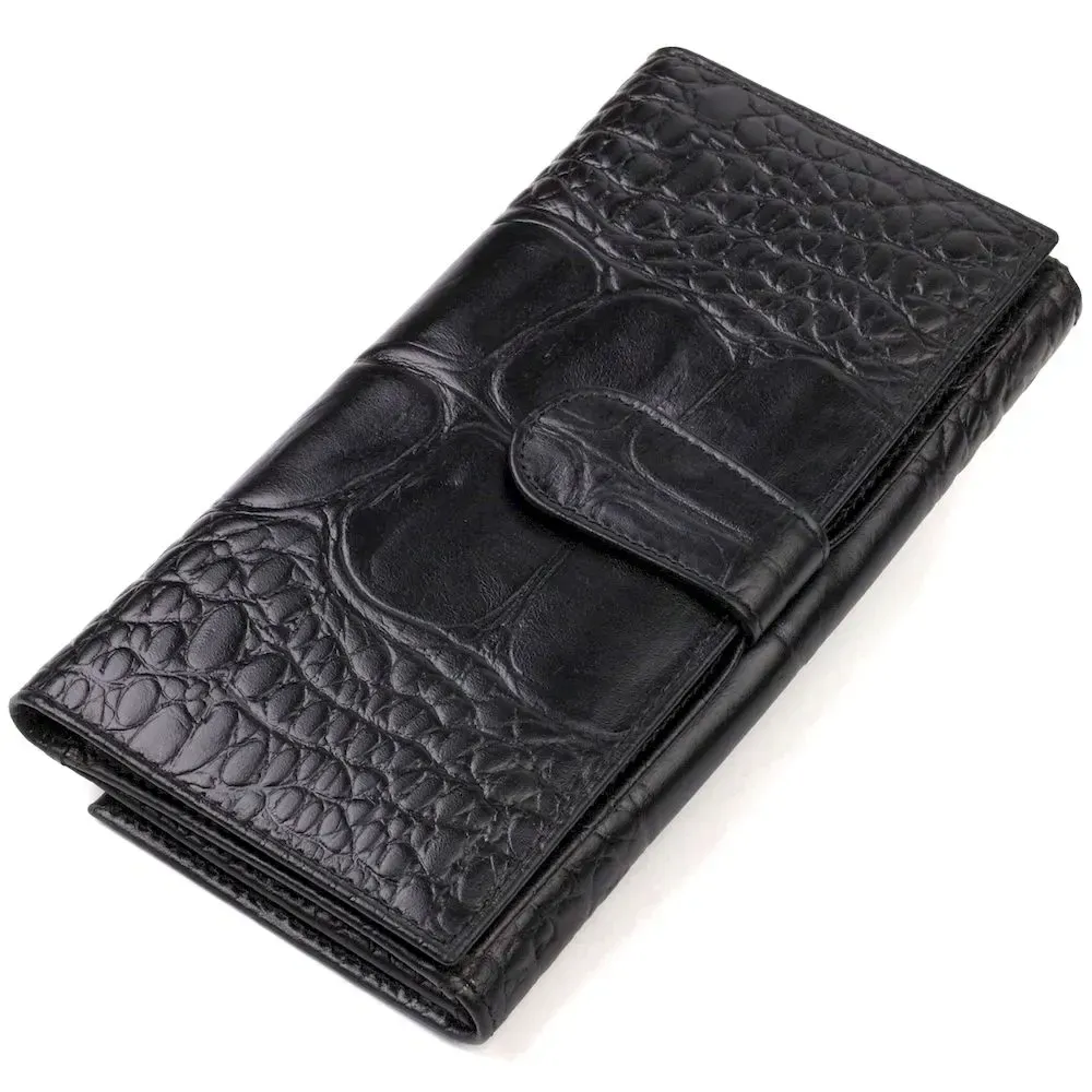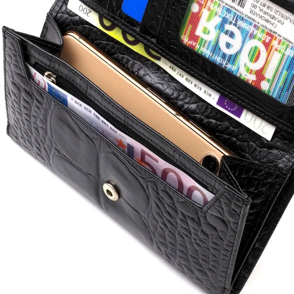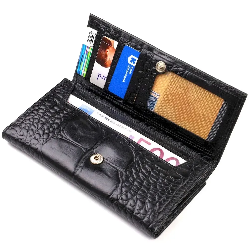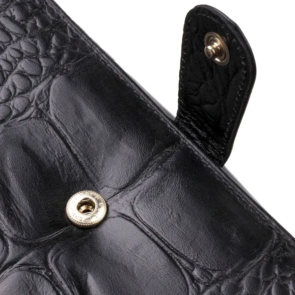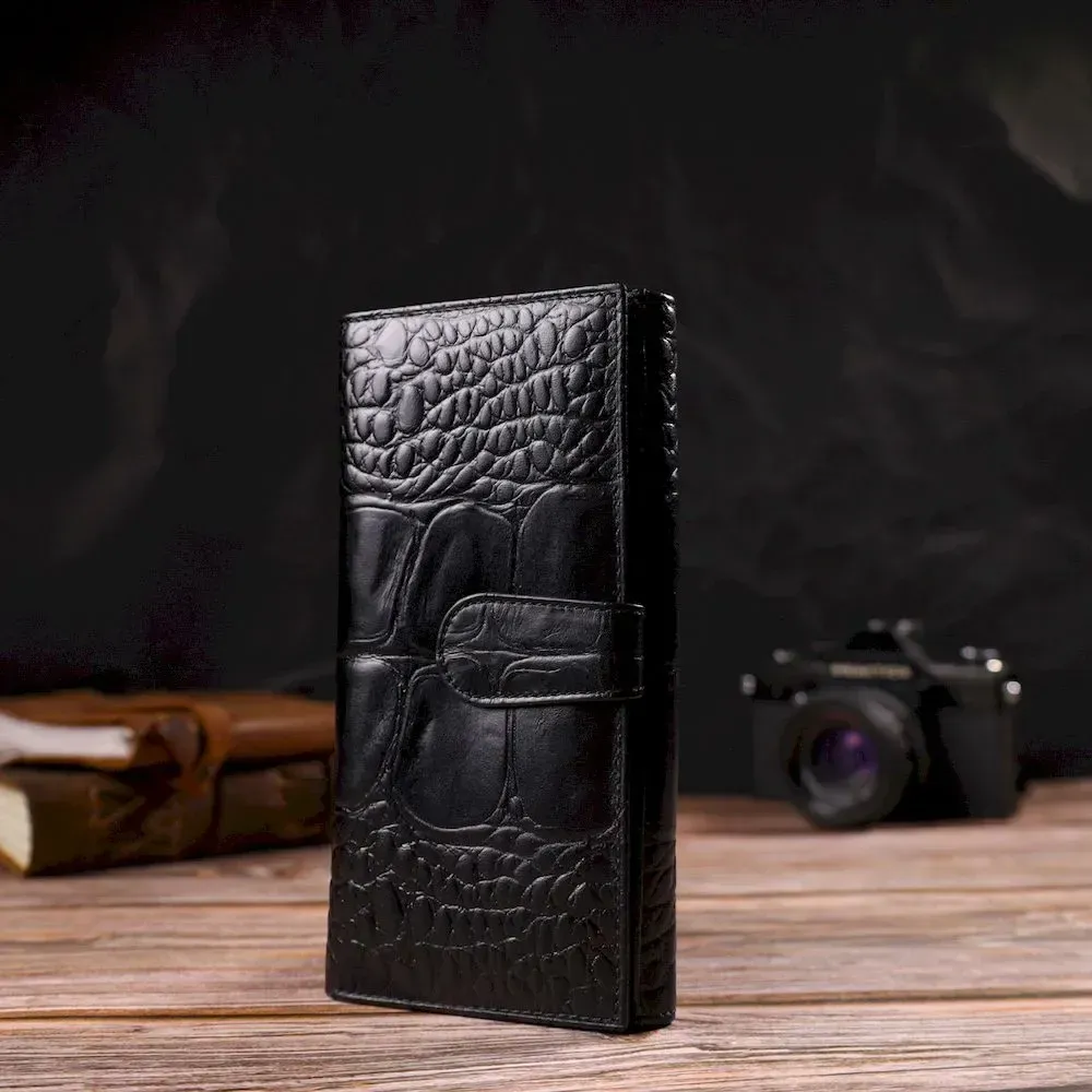 Кошелек для стильных женщин из необычной фактурной натуральной кожи с тиснением под крокодила. Аксессуар имеет одно основное отделение, семнадцать карманов для карточек, четыре прилегающих кармана и монетницу. Особенностью данной модели является наличие блока для кредитных карт, который закрывается хлястиком на кнопку. На лицевой стороне, в правом нижнем углу металлический логотип компании производителя. Если Вы выбрали товар этой фирмы, можете не сомневаться, что изделие прослужит очень долго и не потеряет свой первоначальный вид.