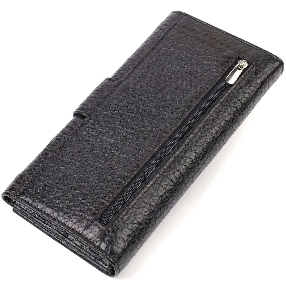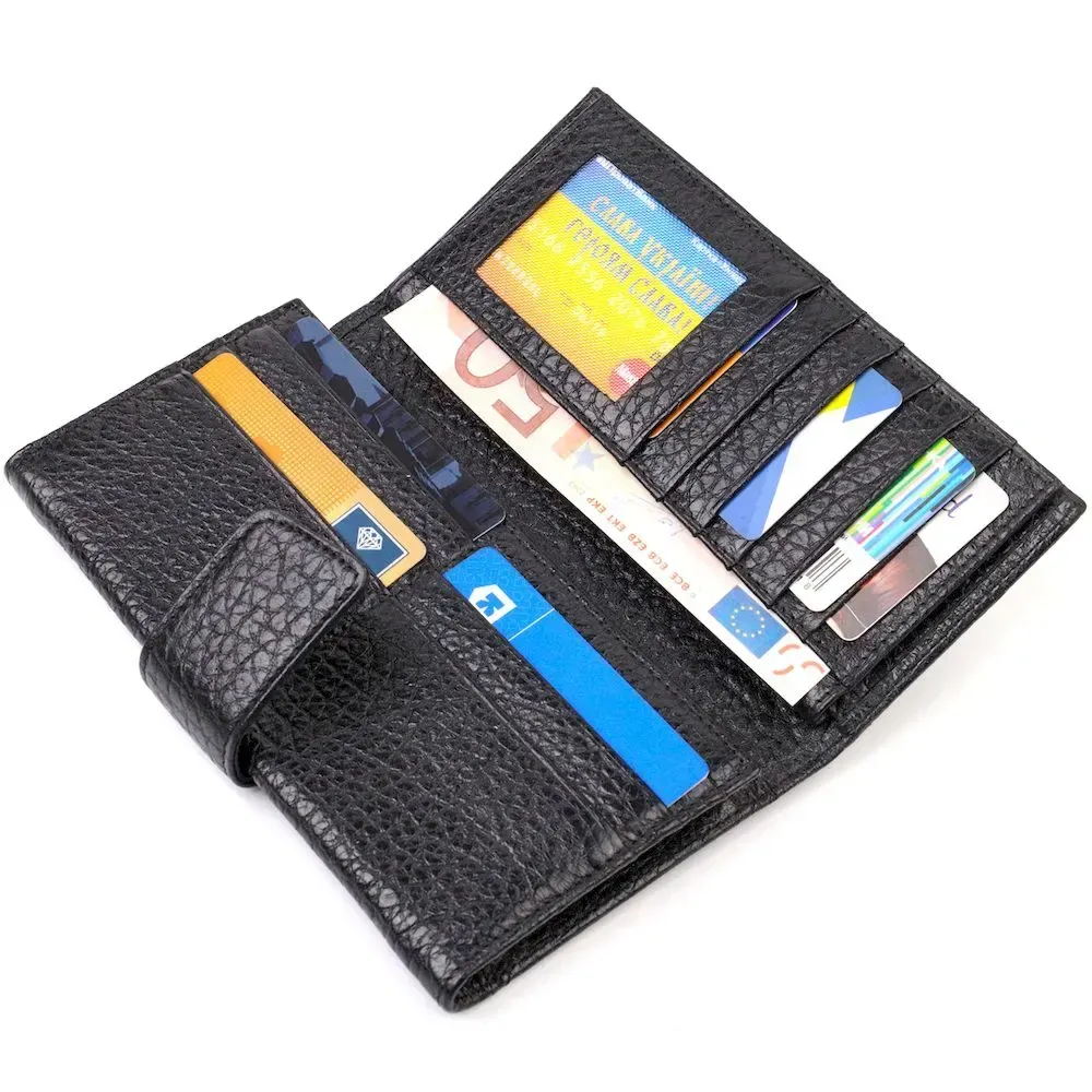 Вместительный мужской кошелек-клатч из натуральной крупнозернистой кожи. Аксессуар имеет одно основное отделение с тканевой перегородкой на молнии, восемнадцать карманов для карточек, карман под сеточкой для пропуска, два скрытых кармана и монетницу. Закрывается аксессуар в два сложения хлястиком на кнопку. На лицевой стороне, в правом нижнем углу металлический логотип компании производителя. Приобретая кожаный аксессуар этой фирмы, себе или на подарок, будьте уверены, что он прослужит Вам не один год.