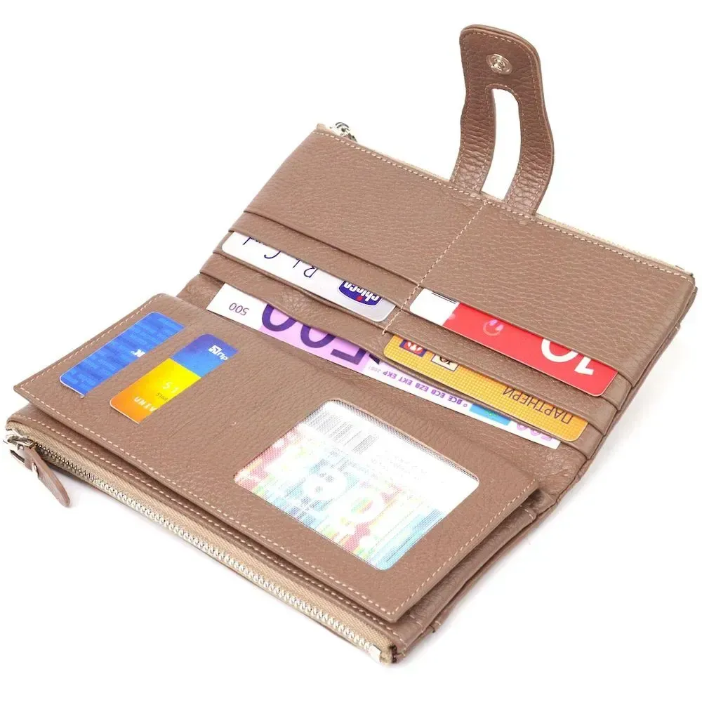 Нежный женский кошелек, из натуральной зернистой кожи. Аксессуар имеет два широких основных отделения, в которые помещаются купюры всех номиналов, две монетницы, двадцать четыре кармана для карточек, два открытых кармана снаружи и одно прозрачное окошко для документов. Закрывается аксессуар хлястиком на кнопку. Если Вы хотите порадовать и себя и удивить близких, то непеременно покупайте кожаные аксессуары в нашем магазине, качество и цена Вас однозначно порадует.