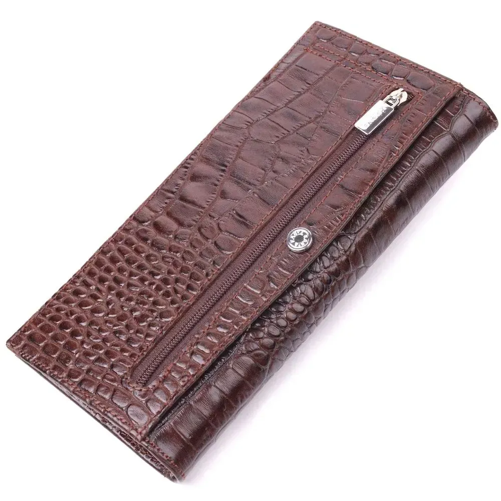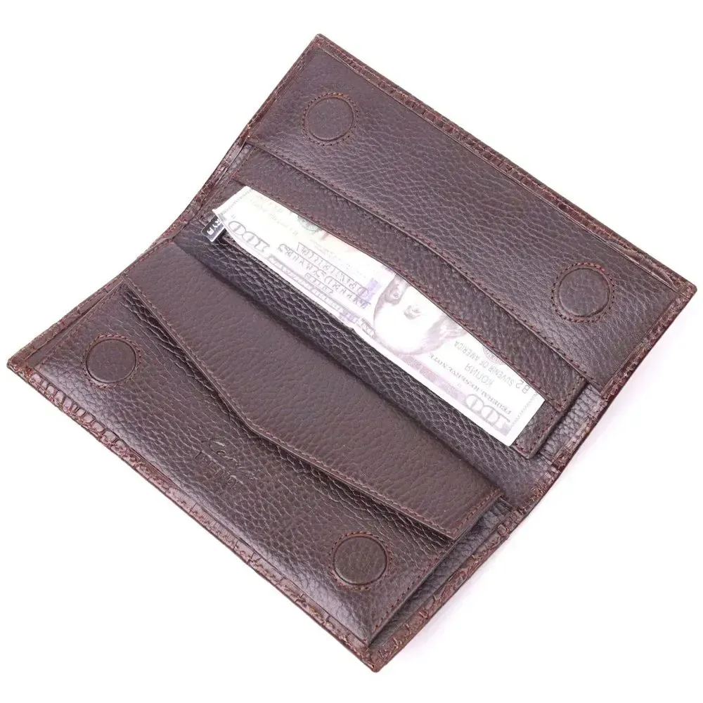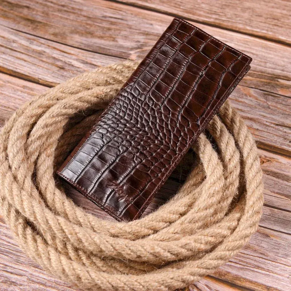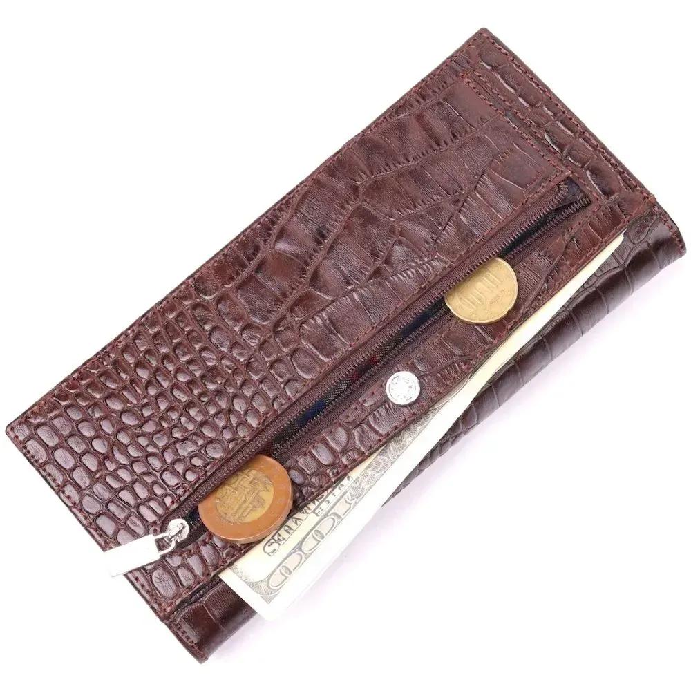 Стильное и надежное портмоне из натуральной фактурной кожи с тиснением под крокодила. Изделие имеет продуманный до мелочей дизайн и качественную фурнитуру, очень практичное. В портмоне помещаются купюры в развернутом виде. Дополнен аксессуар блоком для кредиток, который извлекается, он располагается внутри кошелька в специальном кармашке. Изделие удобно лежит в руке. Отличный подарок для ваших близких.