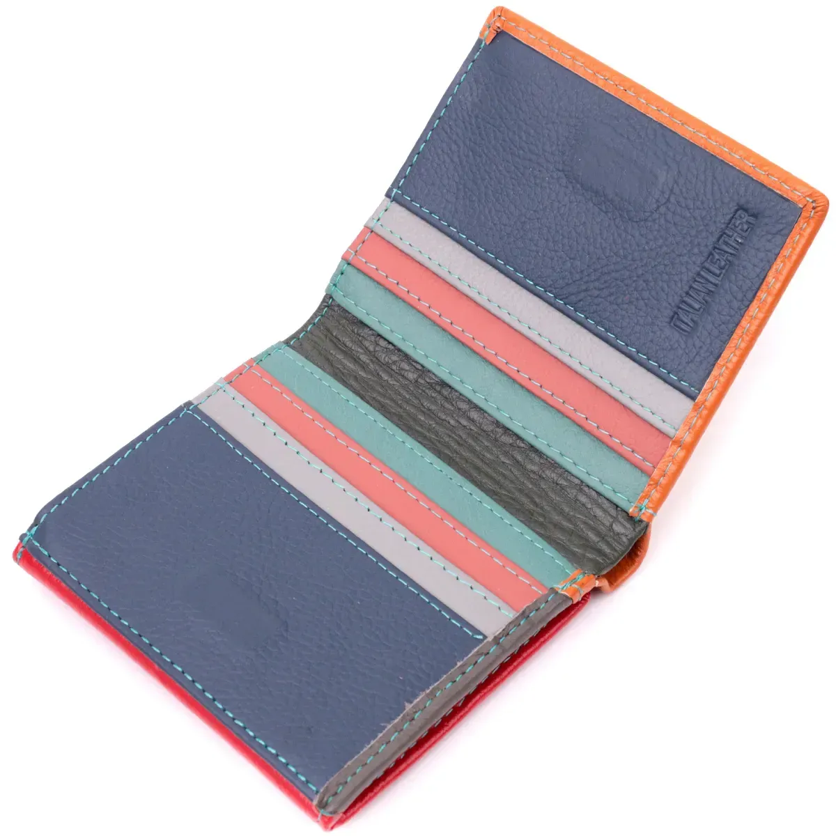 Женское яркое портмоне в два сложения из натуральной кожи высочайшего качества. Фишкой этого кошелька является его многоцветная гамма, такой аксессуар сразу бросается в глаза, состоит он из двух вместительных отделений для купюр, шести ячеек для карт, двух скрытых карманов и кармана для монет. Снаружи изделие прошито ровной строчкой бирюзового цвета по краю и украшено металлическим логотипом компании производителя. Портмоне дополнено надежной фурнитурой и крепкой подкладкой. Укомплектован кошелек в фирменную картонную коробку белого цвета.