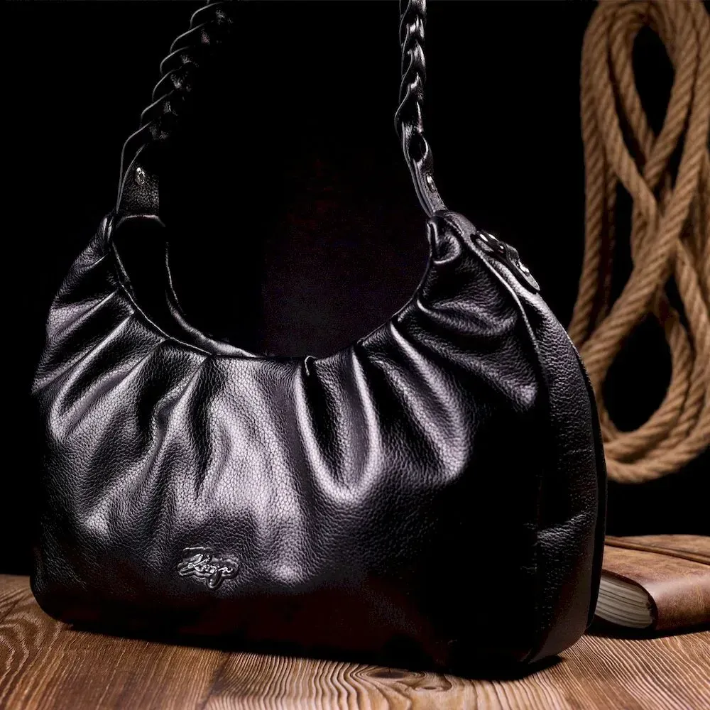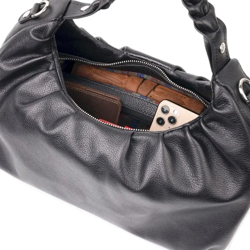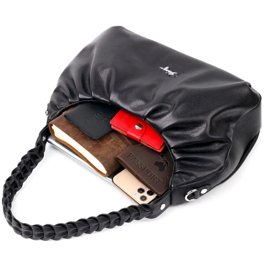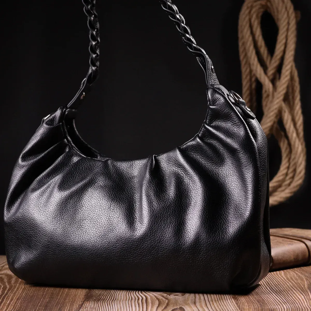 Превосходная сумка-багет среднего размера из натуральной крупнозернистой кожи, в классическом черном цвете. Изделие имеет надежную плетенную ручку для переноса в руке, а также кожаный съемный и регулируемый по длине, плечевой ремень. Сумка функциональна и удобна в эксплуатации, изделие имеет качественную фурнитуру серебристого цвета и прочную подкладку. Аксессуар упакован в фирменный текстильный мешок Karya.Сумка из натуральной кожи всегда будет отличным подарком любой женщине.