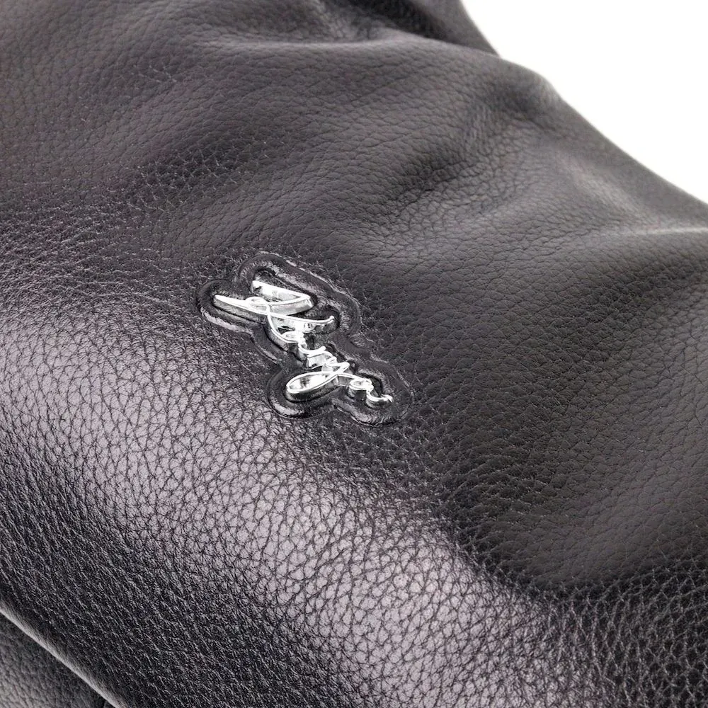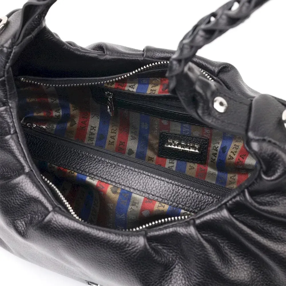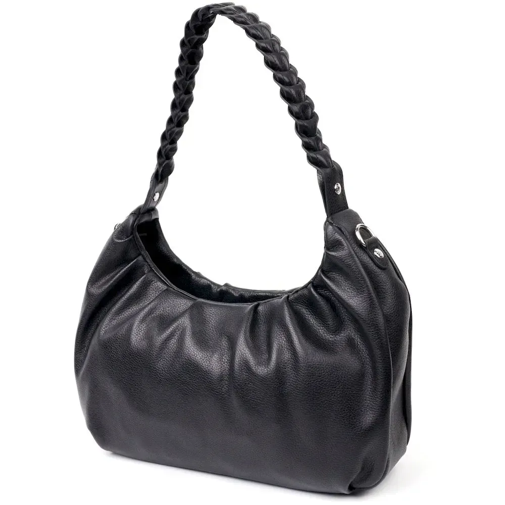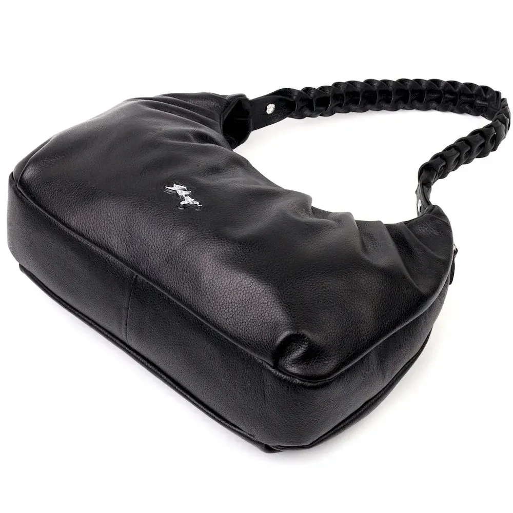 Превосходная сумка-багет среднего размера из натуральной крупнозернистой кожи, в классическом черном цвете. Изделие имеет надежную плетенную ручку для переноса в руке, а также кожаный съемный и регулируемый по длине, плечевой ремень. Сумка функциональна и удобна в эксплуатации, изделие имеет качественную фурнитуру серебристого цвета и прочную подкладку. Аксессуар упакован в фирменный текстильный мешок Karya.Сумка из натуральной кожи всегда будет отличным подарком любой женщине.