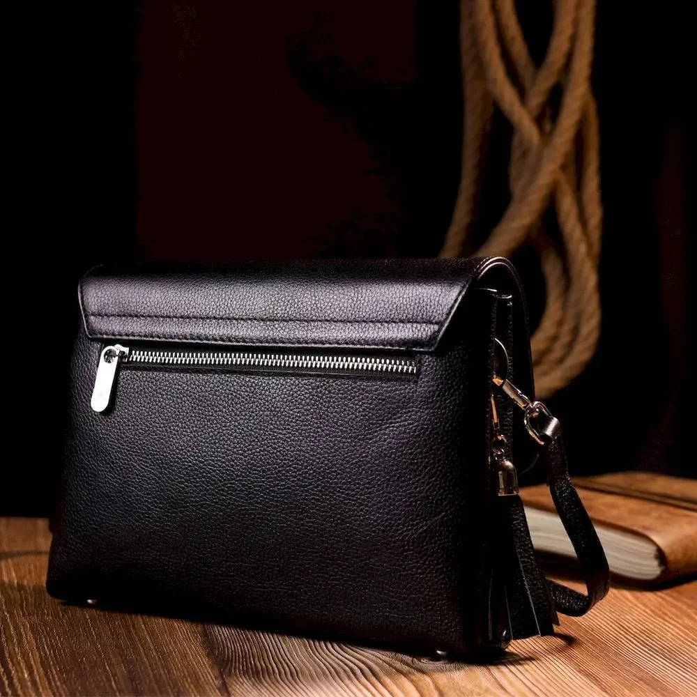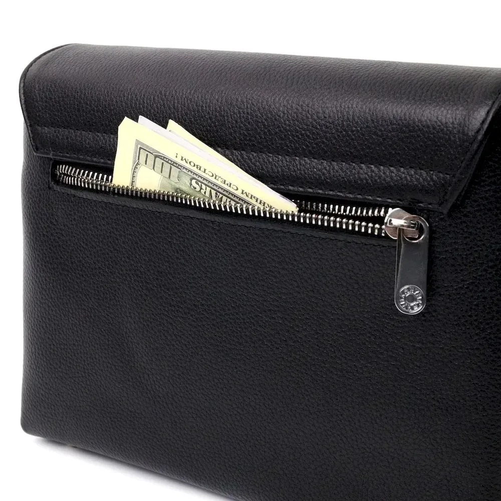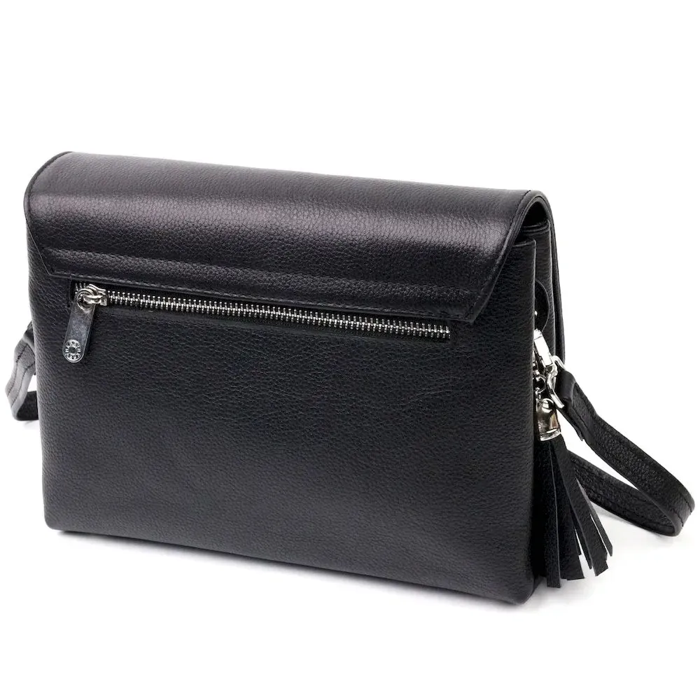 Красивая сумка-клатч небольшого размера из натуральной кожи, в классическом черном цвете. Фурнитура серебряного цвета. Сумку удобно носить на плече или через плечо и как клатч в руках. Сумка упакована в текстильный чехол. Сумка из натуральной кожи всегда будет отличным подарком любой женщине.